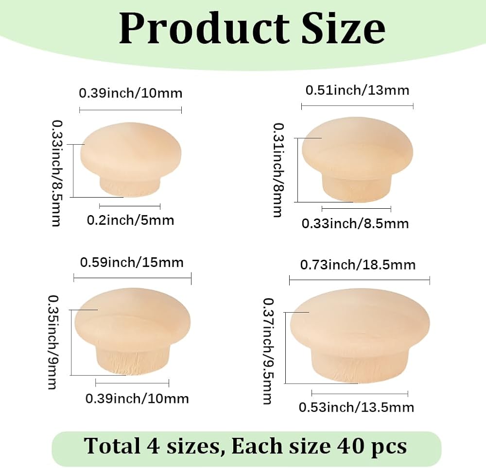 4 Sizes Screw Hole Plugs: Wooden hole plugs are available in 4 sizes, 40pcs each size, 10x8.5mm(0.39x0.33 inch), pin: 5mm; 15x9mm(0.59x0.35 inch), pin: 8.5mm; 18.5x9.5mm(0.73x0.37 inch), pin: 8.5mm; 13x8mm(0.51x0.31 inch), pin: 8.5mm