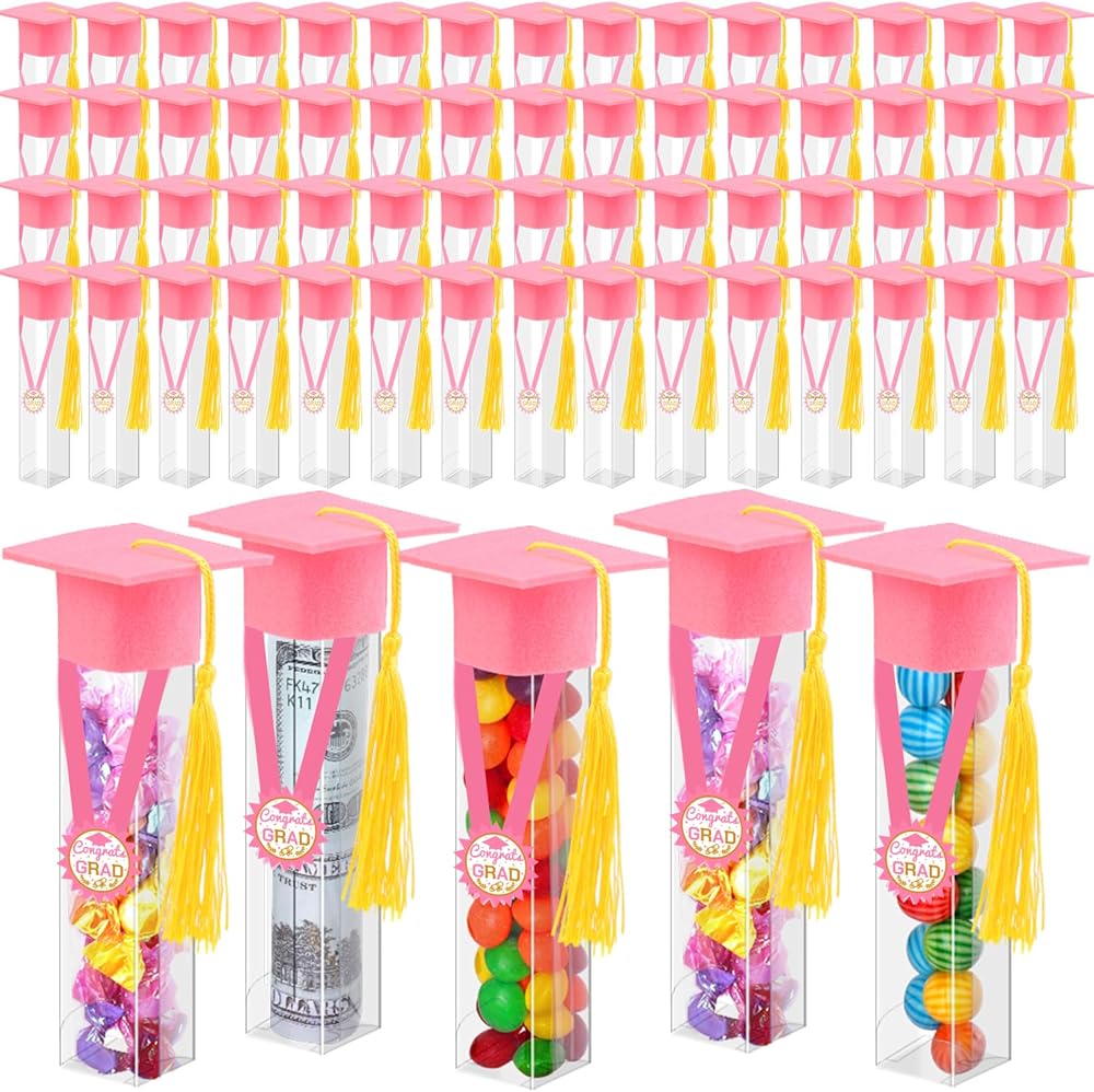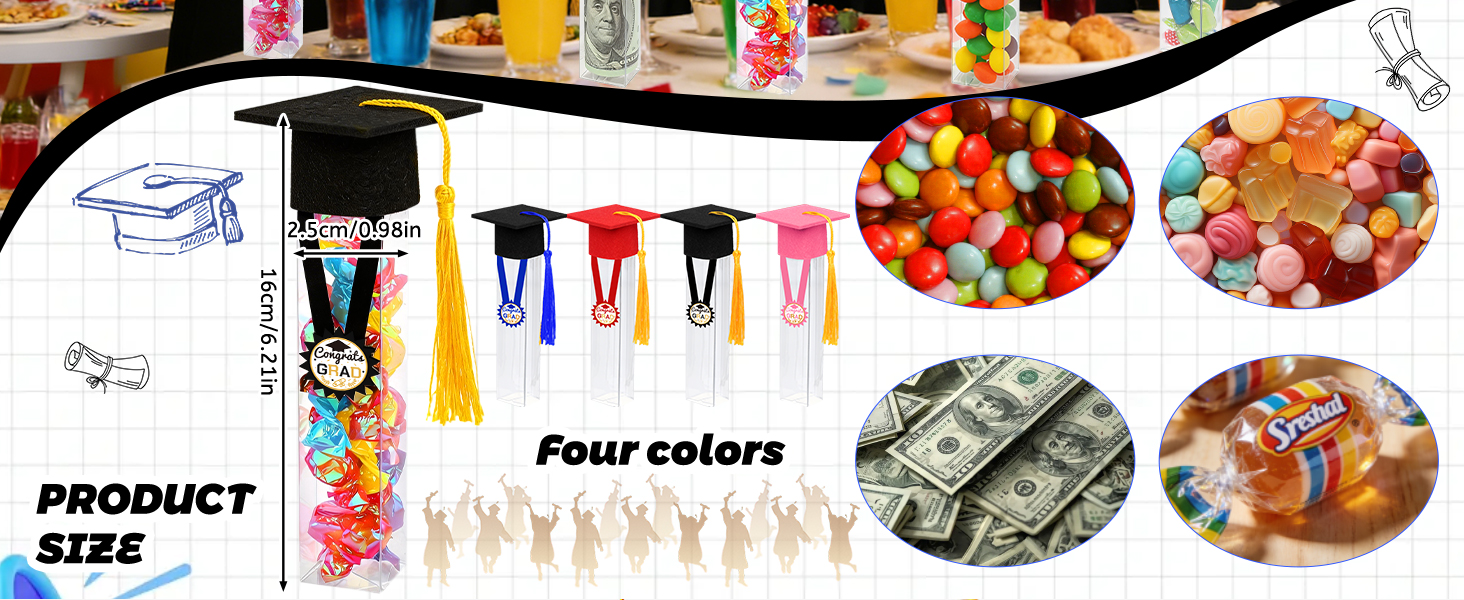 Proper Size: Candy tube size of about 1x1x6 inches/ 2.54x2.54x15.3 cm, a felt graduation cap sizing around 1 inch/ 2.54 cm, these clear tubes with caps are well sized to hold an assortment of treats and mementos