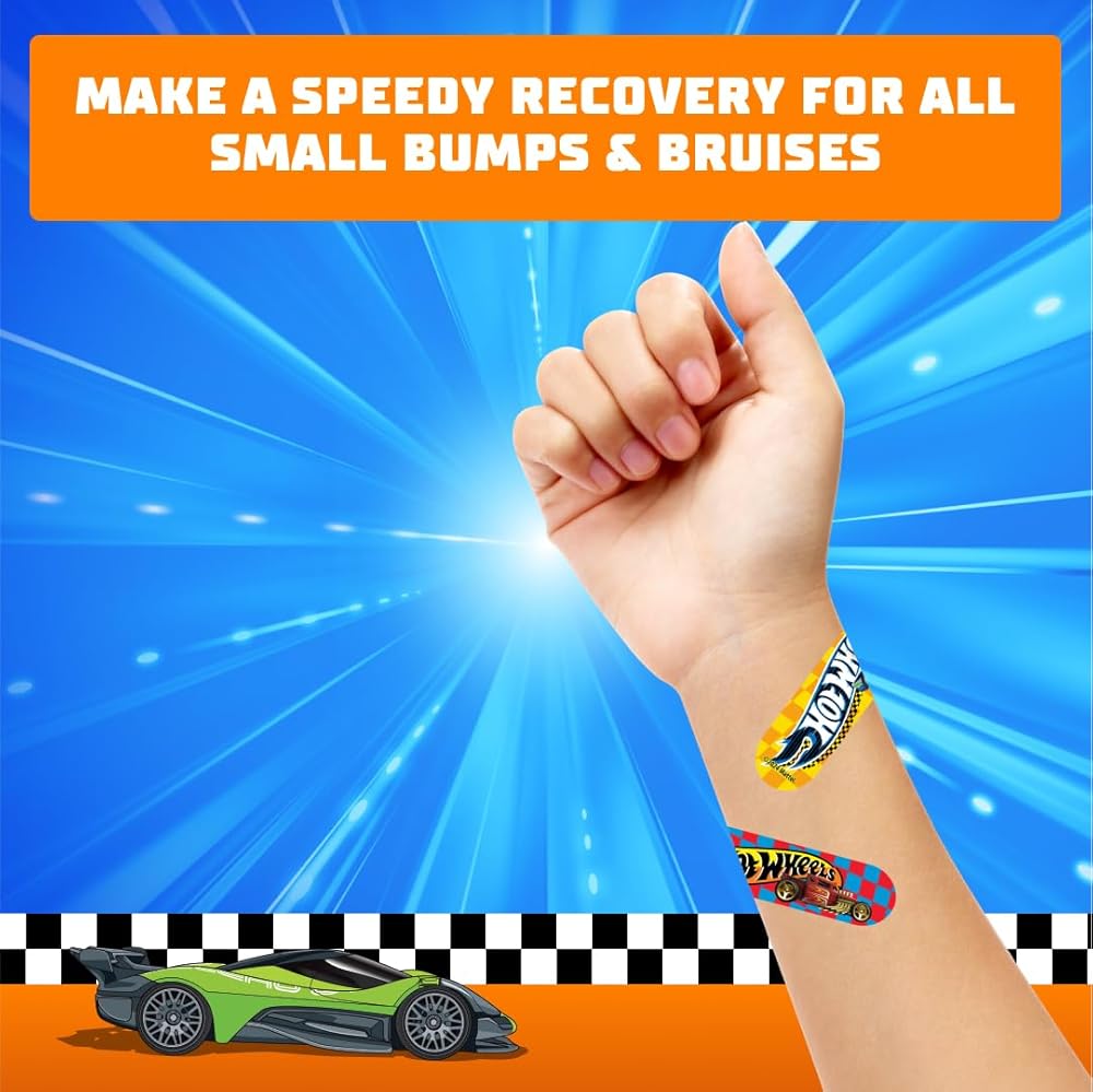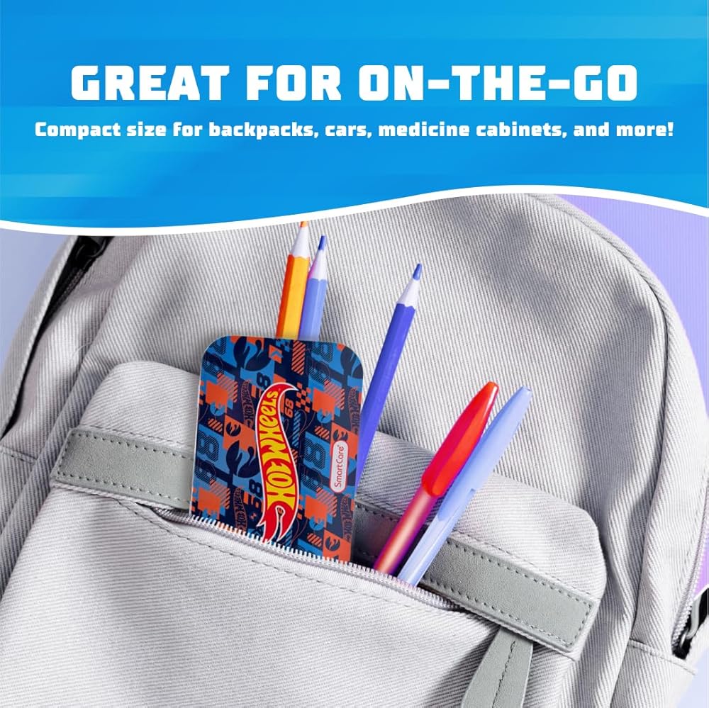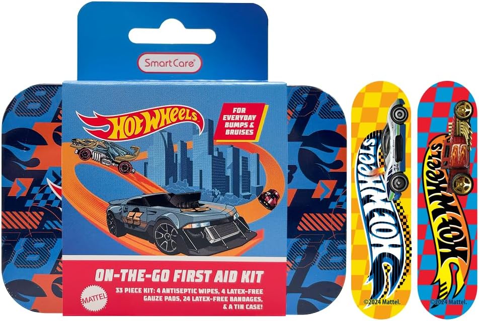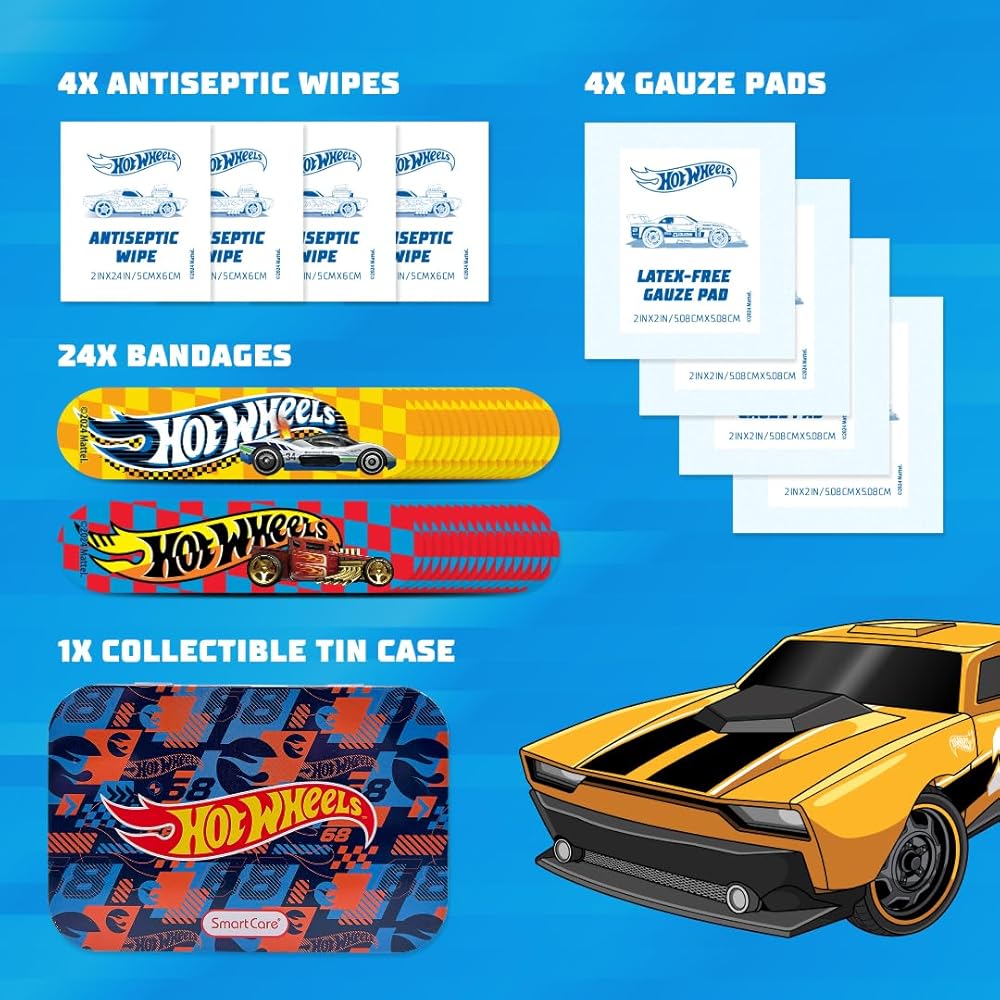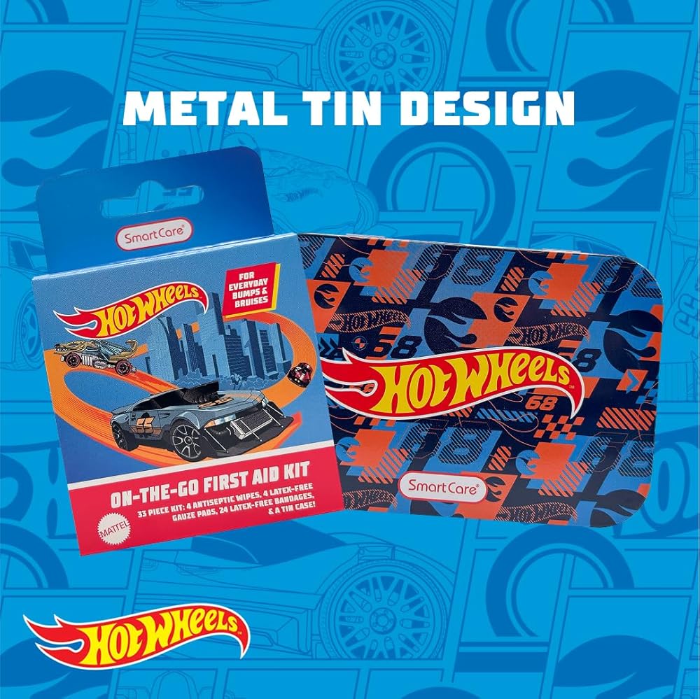 Smart Care Hot wheels First Aid Kits keep you covered... literally! Each kit includes 24 bandages, 4 antiseptic wipes, and 4 latex-free gauze pads. With a convenient storage tin, you're covered at home and on-the-go. Use the antiseptic wipes to clean minor cuts and scrapes! The assorted bandages feature two fun Hot Wheels designs to keep your skin protected.