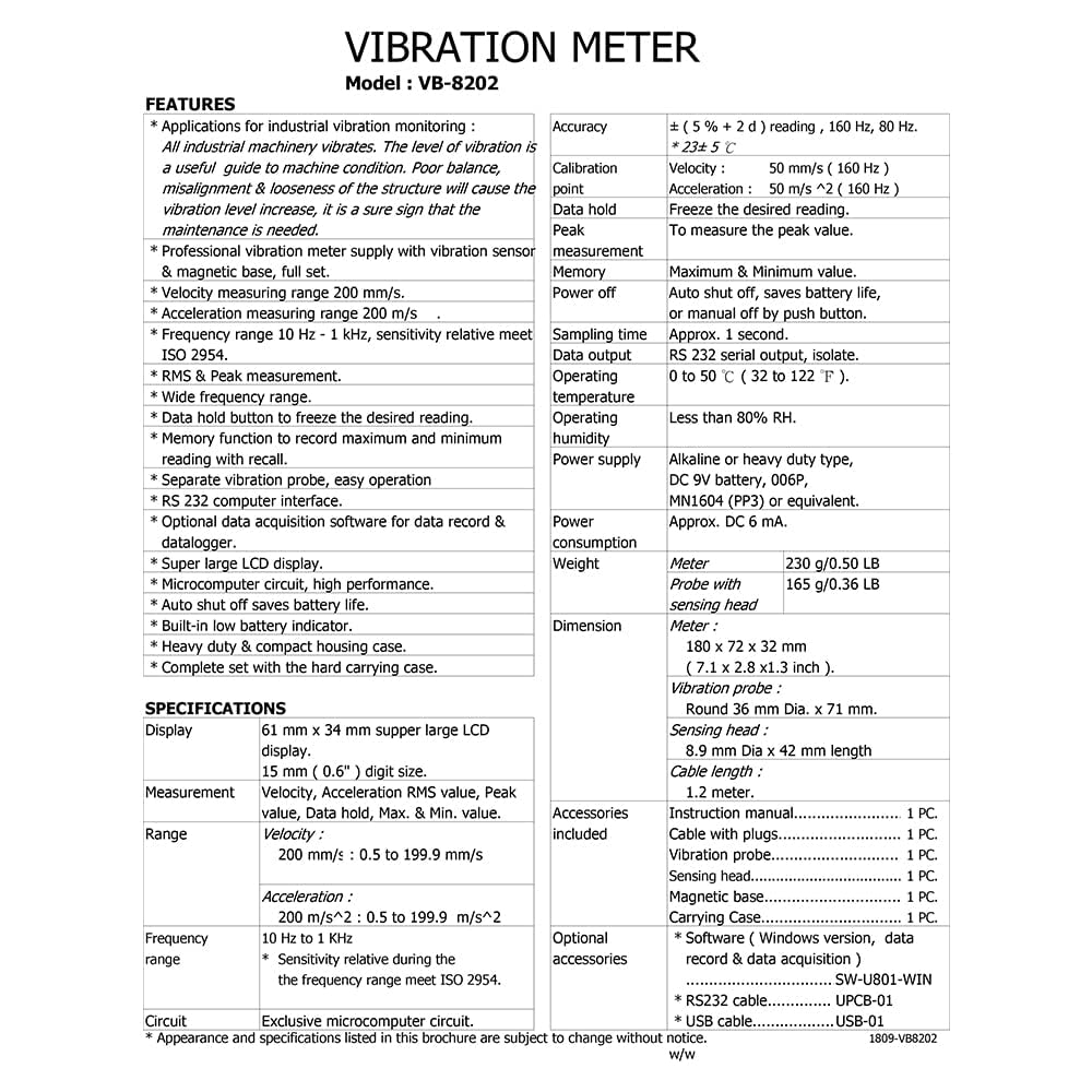 Supply scope: One unit of VB-8202 Vibration analysis meter includes an instruction manual, RS‑232 cable, probe, carrying case. Applications are like these are used in many installations and machines and in developing products in the condition.