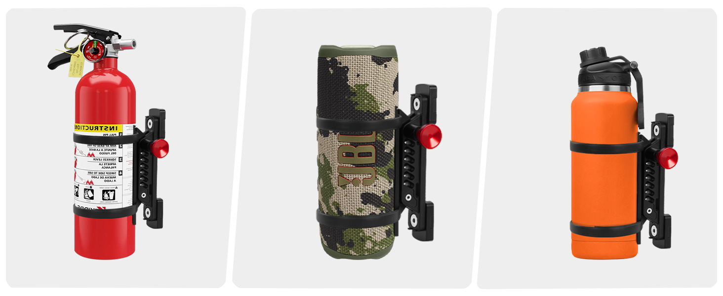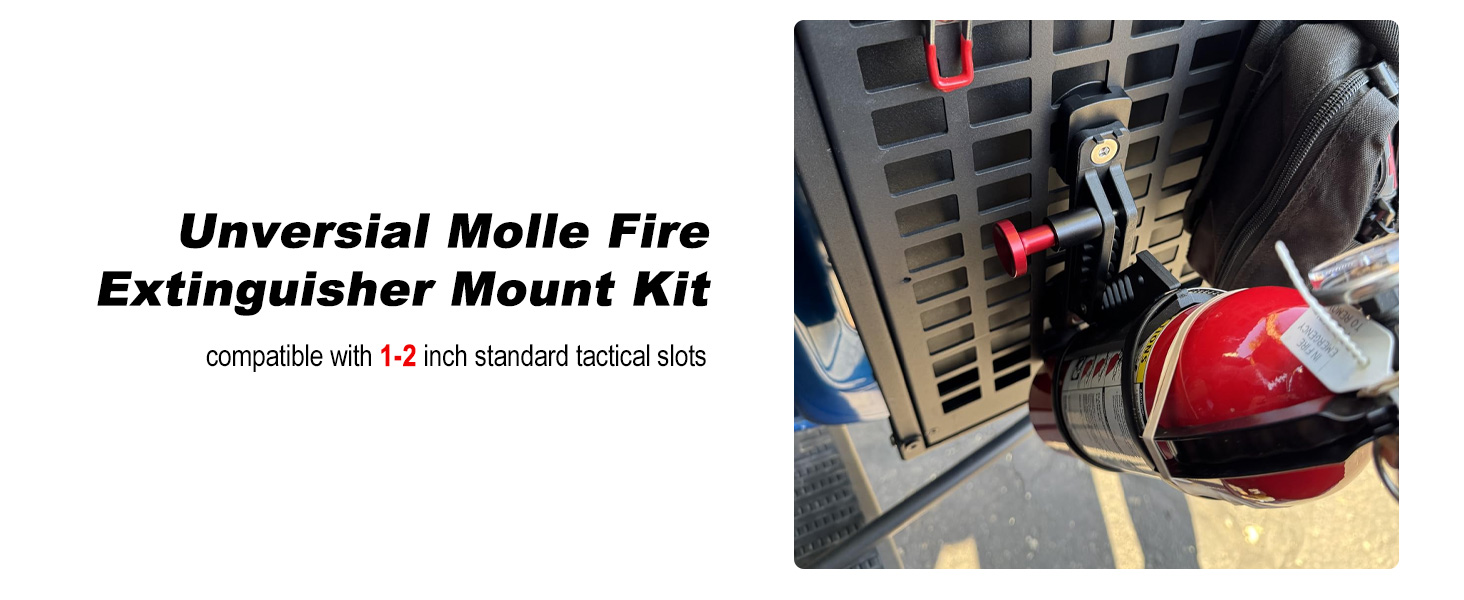 【Utility】: Beyond its use as a fire extinguisher holder, this versatile item can also function as a water cup holder, a Bluetooth speaker stand, and allows for custom stand development. Ideal for garages, tool sheds, or workshops, items like bed racks, roof racks, and cargo rails equipped with MOLLE boards help maintain cleanliness and organization
