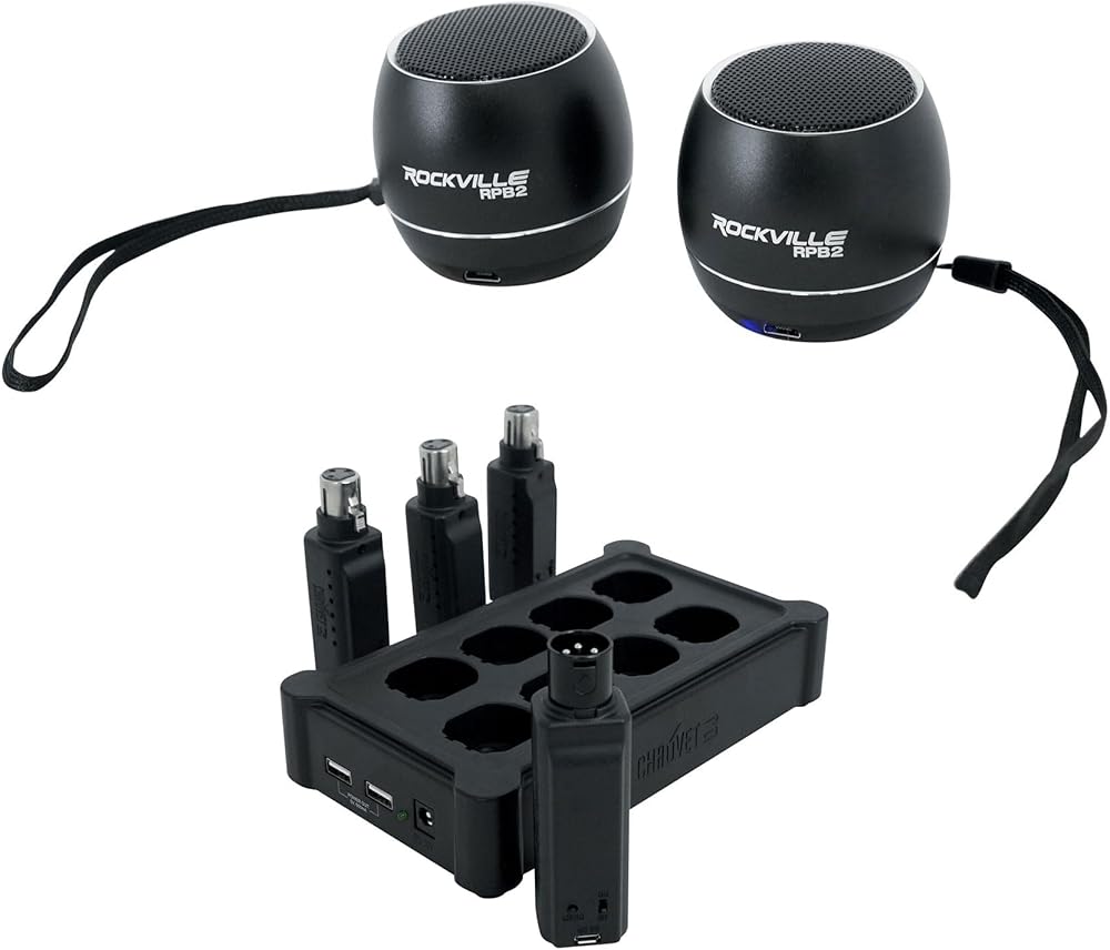 Description of DFIXLRPACK: Make any DMX-compatible light wireless! The wonders of wireless DMX control have arrived to previously non-wireless lights with D-Fi XLR. This cutting-edge technology provides instant wireless communication through compact battery-powered wireless D-Fi receiver or transmitter units that plug directly into the XLR port of DMX-compatible lights. Contact pins charge all D-Fi XLRs without the need for any cables. The D-Fi XLR Pack includes 1 transmitter, 3 receivers and 1 multi-charger. The multi-charger simultaneously charges up to 8 D-Fi XLRs (additional units sold separately). D-Fi XLR Pack even has 2 additional USB ports to charge additional devices. Description of RPB3-BLACK: Pair Rockville RPB3-BLACK Handheld Wireless Linking Portable Bluetooth Speakers