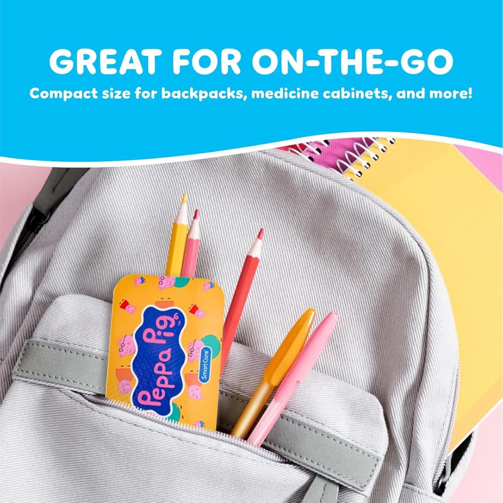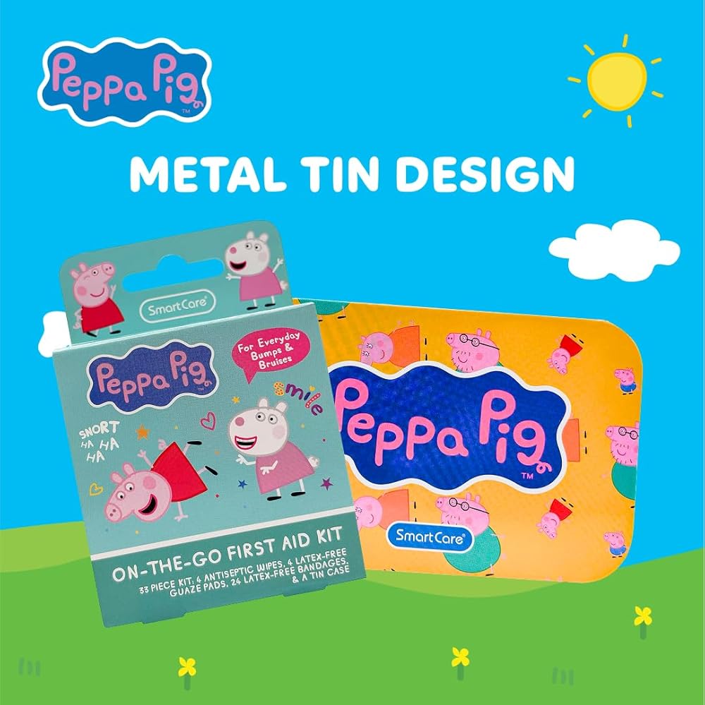 Smart Care Peppa Pig First Aid Kits keep you covered... literally! Each kit includes 24 bandages, 4 antiseptic wipes, and 4 latex-free gauze pads. With a convenient storage tin, you're covered at home and on-the-go. Use the antiseptic wipes to clean minor cuts and scrapes! The assorted bandages feature two fun Peppa Pig designs to keep your skin protected. [Complete First Aid Kit] Includes 24 assorted bandages, 4 antiseptic wipes, and 4 latex-free gauze pads for everyday minor cuts and scrapes. [Convenient Storage] Compact and easy to store at home or toss in a backpack, diaper bag, or travel bag for on-the-go care. [Gentle Cleansing] Antiseptic wipes help clean minor injuries to support proper wound care and healing. [Fun & Protective Designs] Assorted bandages feature adorable Peppa Pig designs to protect skin and make boo-boos a little less scary for kids.