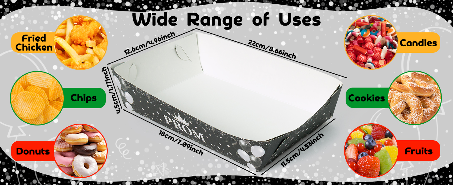 Ideal dimensions: You will receive 50 pieces of prom night food trays, with dimensions of 8.66 x 4.96 x 1.77 inches (top) and 7.09 x 4.53 inches (bottom). These unassembled disposable paper plates are designed to hold nachos, snacks, fried chicken, veggies, and more, making them perfect for your high school or college graduation prom night celebration