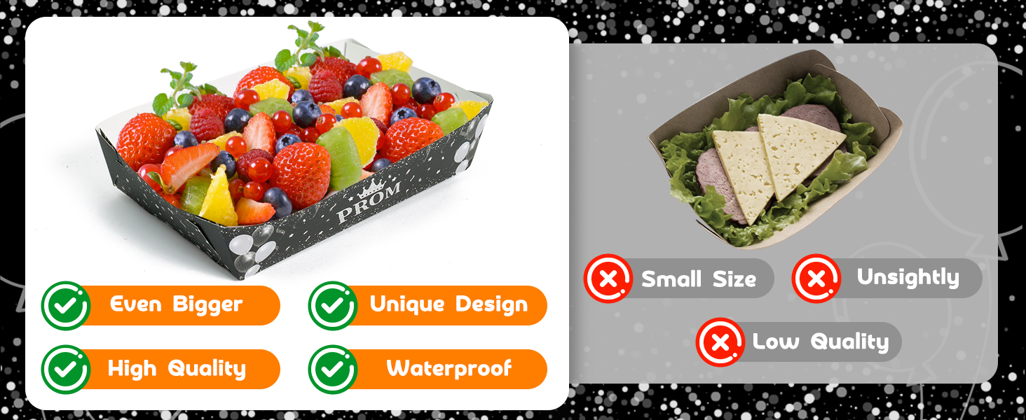 Waterproof Disposable Paper Plates: Made from high-quality, waterproof paper material, these prom night food trays are sturdy enough for wet or greasy foods like nachos, fried chicken, and snacks. They are disposable, so there's no washing up required after your prom party, letting you spend more time celebrating and less time cleaning up