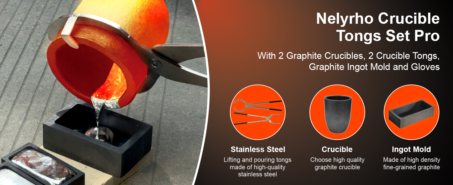 - المواد: فولاذ مقاوم للصدأ متين للملاقط، وجرافيت عالي الجودة لقوالب البوتقة والسبائك