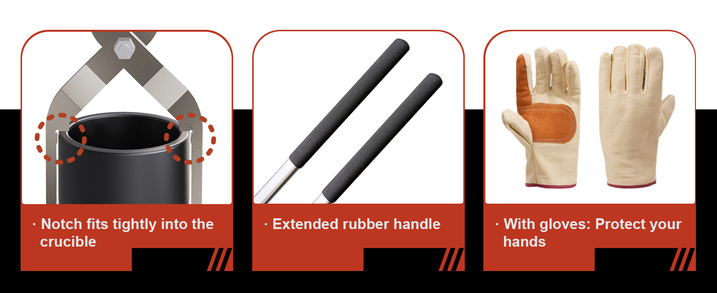 - ملقط صب البوتقة: ملقط صب مصمم خصيصًا لبوتقات بوزن 4 كجم، مما يوفر صبًا سلسًا ومتحكمًا فيه