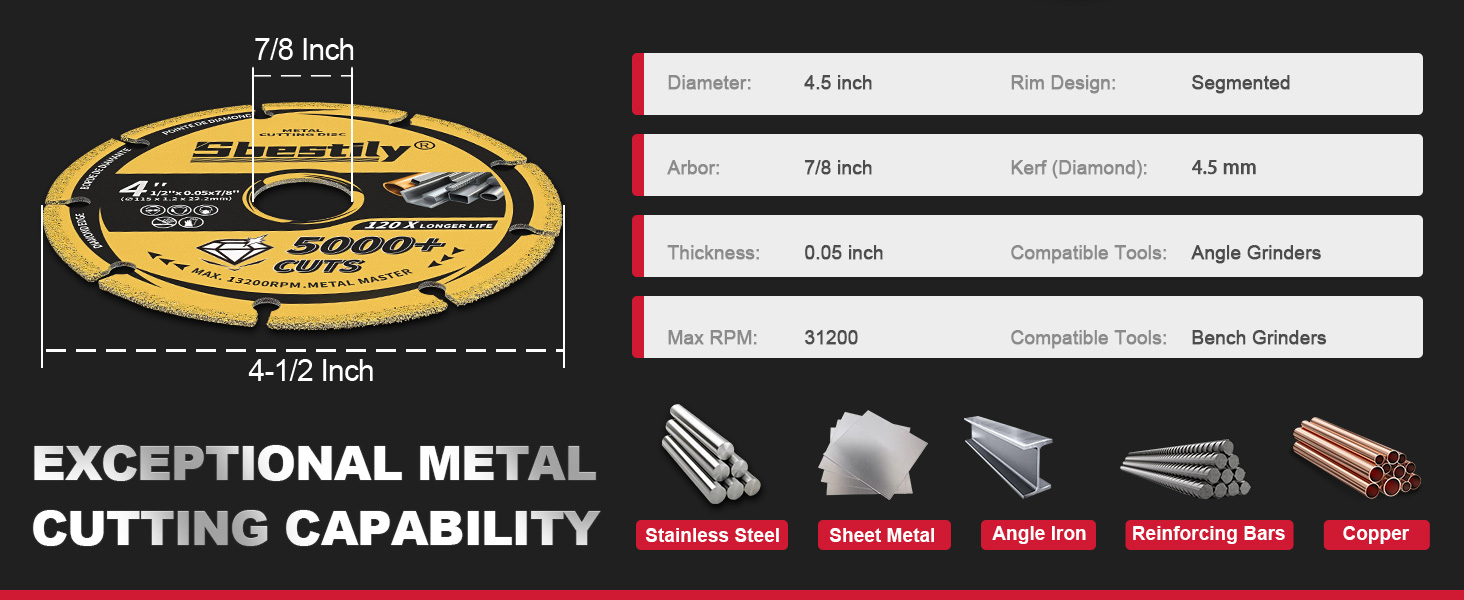 Compatible Designs: Standard 4 1/2in diameter with 7/8'' (22.23mm) arbor is compatible with all major angle grinder brands. Compatible with circular saws via 5/8-inch reducer washer to meet the needs of different equipment, with a maximum cutting speed of 13,200 RPM