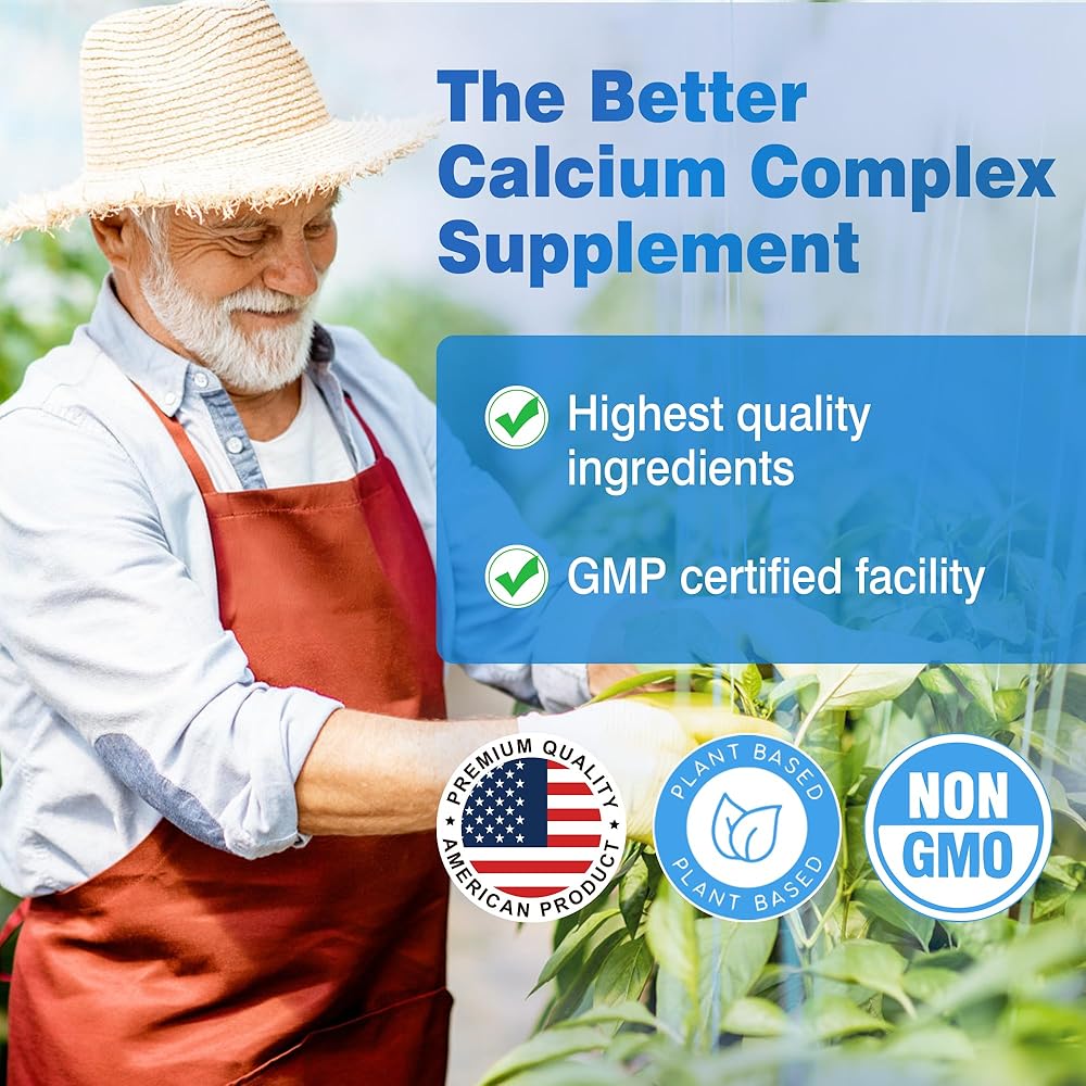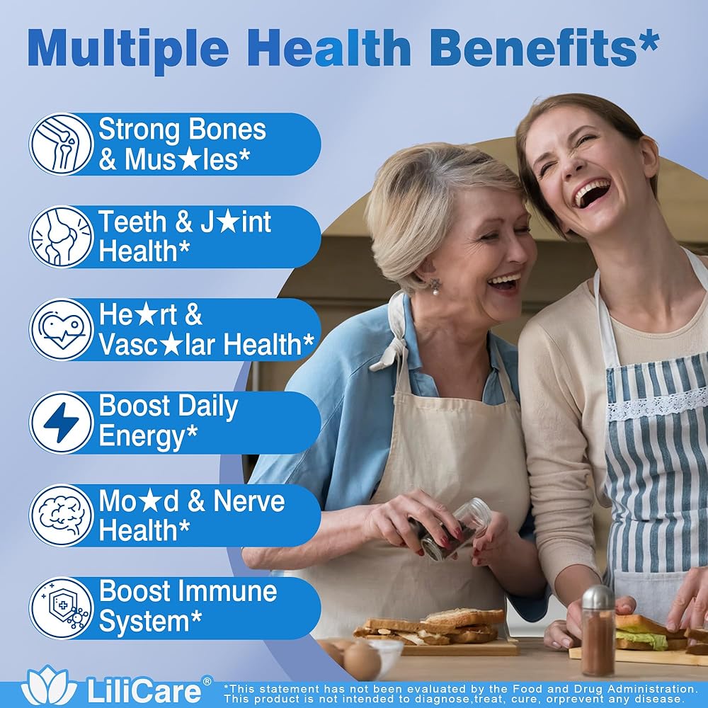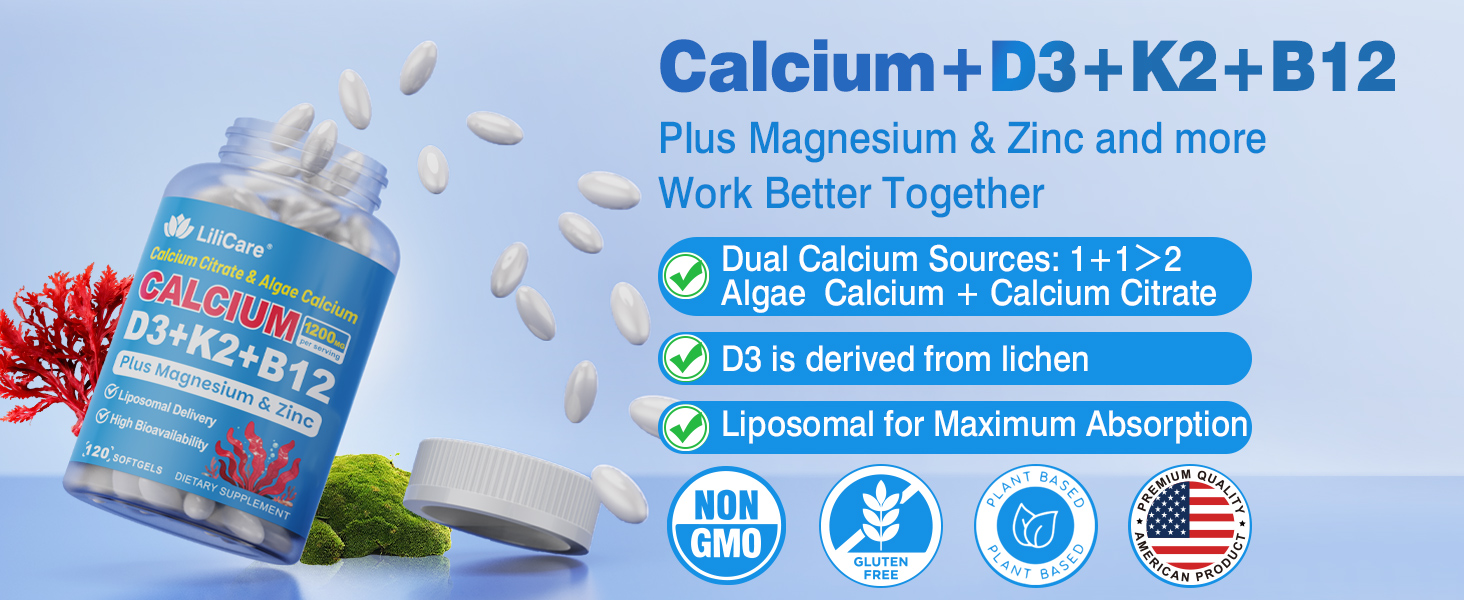 Dual Calcium Sources (Natural Plant-Based Algae Calcium and Calcium Citrate): Organic algal calcium is rich in over 70 trace minerals that aid in calcium absorption. It is more soluble, gentler, and its structure is closer to the calcium structure in human bones. Combined with the gentle and highly absorbable calcium citrate, it is easier to digest and absorb than calcium carbonate, making it suitable for people prone to constipation and those with insufficient stomach acid secretion.
