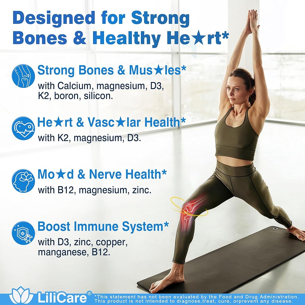 9 essential nutrients for bone health: D3 promotes calcium absorption, while K2 activates osteocalcin, guiding calcium to the bones. K2 helps calcium be properly absorbed and delivered to the bones. The combination of D3 + K2 + calcium supports optimal calcium absorption and distribution, contributing to bone mineralization and density. Magnesium citrate assists in calcium and D3 metabolism, while manganese + copper + boron + silicon + zinc support the collagen matrix of bones and jo★ints.