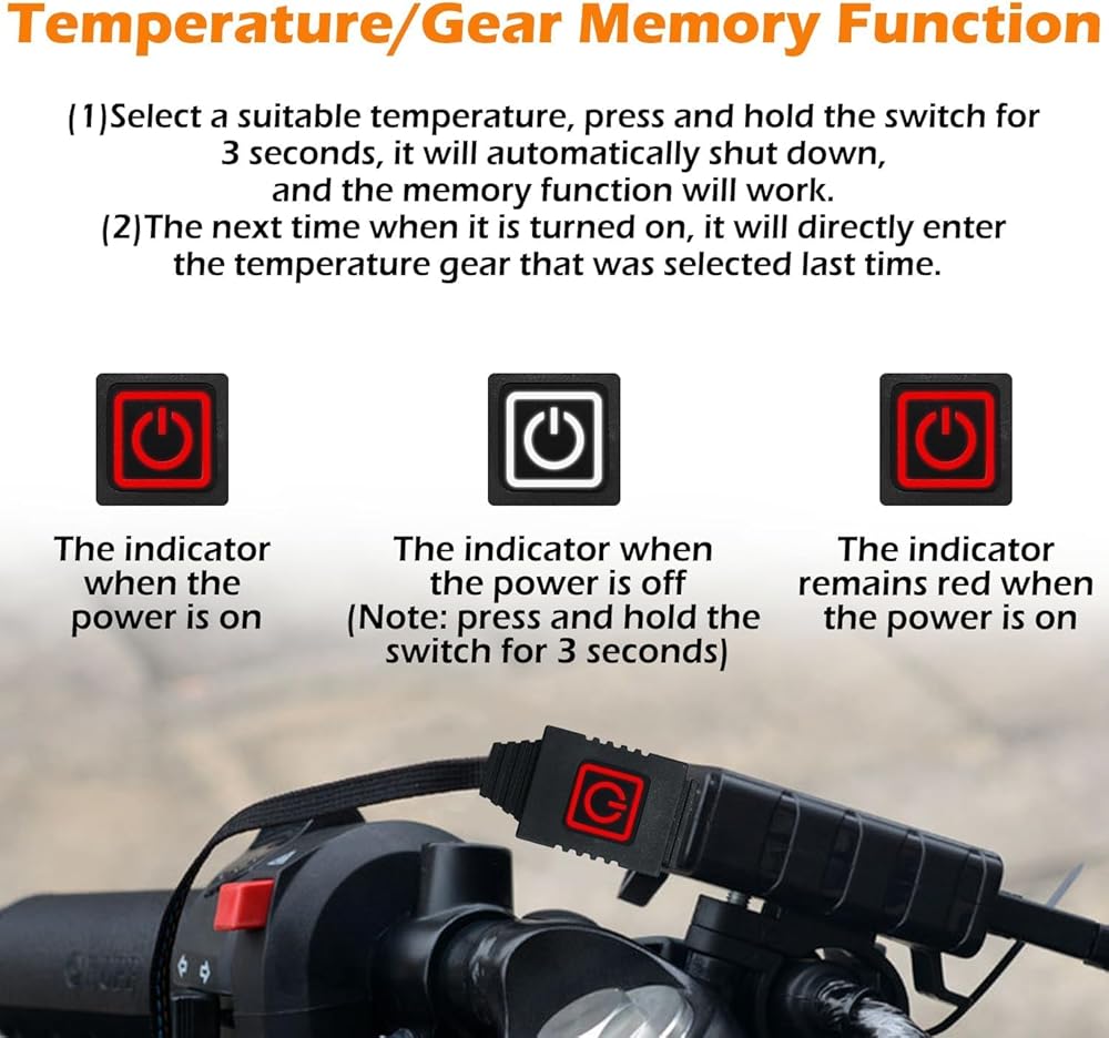 2. Smart Memory Function: One-Touch Access to Your Preferred Temperature No more repeated adjustments. After setting your ideal temperature, press and hold the power button for 3 seconds to shut down. The system automatically saves the current setting. Restore it instantly upon next startup, eliminating tedious operations and letting you focus on your ride.