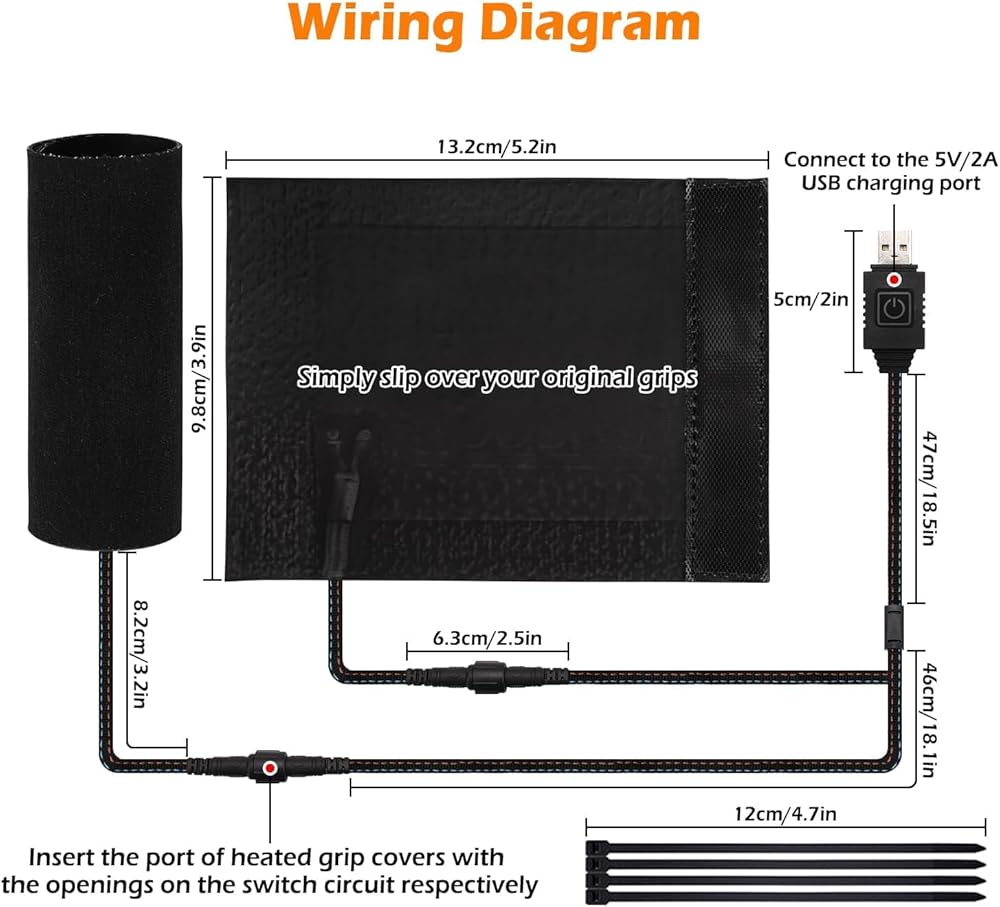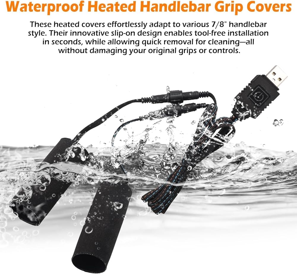 4. Universal fit for all two-wheeled vehicles Highly elastic material stretches to fit grips of any diameter. One set works for gas motorcycles, e-bikes, or regular bicycles—warmth wherever you ride. Note: Ensure power source delivers stable 5V voltage and 2A current for optimal heating.