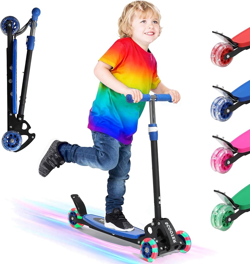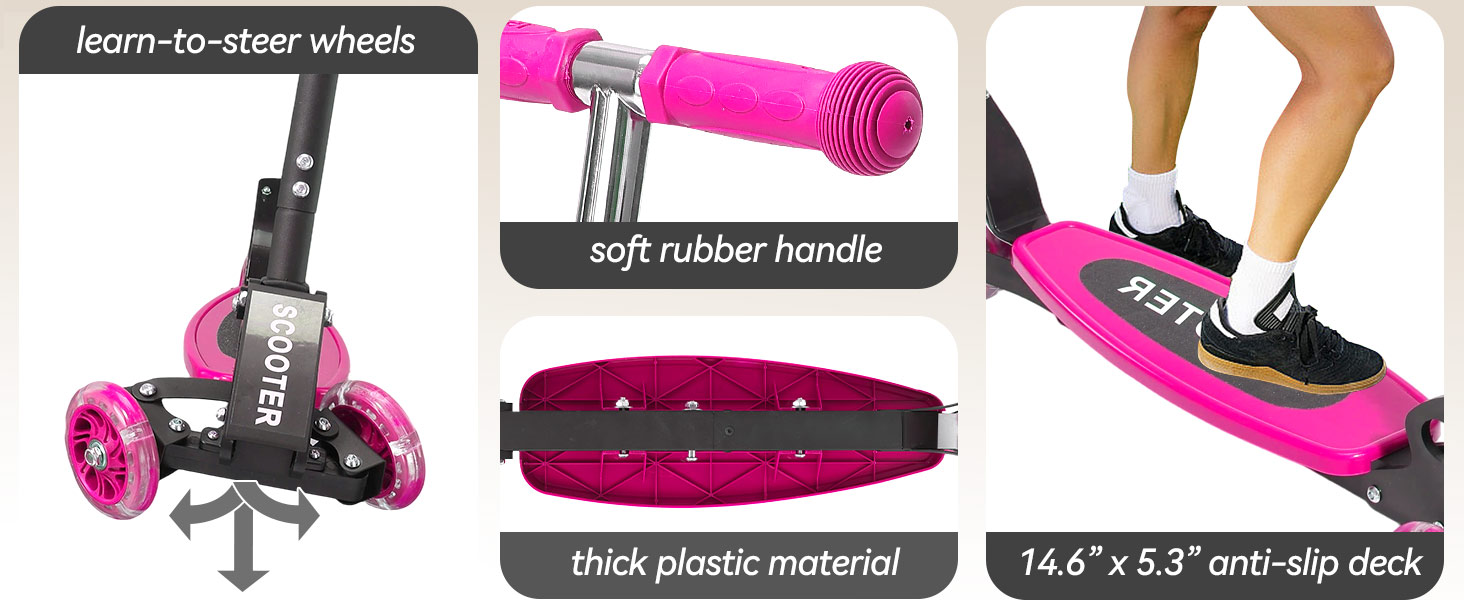 【Learn-to-Steer Three Wheels Scooter】Gravity-driven lean-to-turn system builds balance naturally. Safer than 2-wheel ones for beginners. It helps toddlers master balance and coordination.