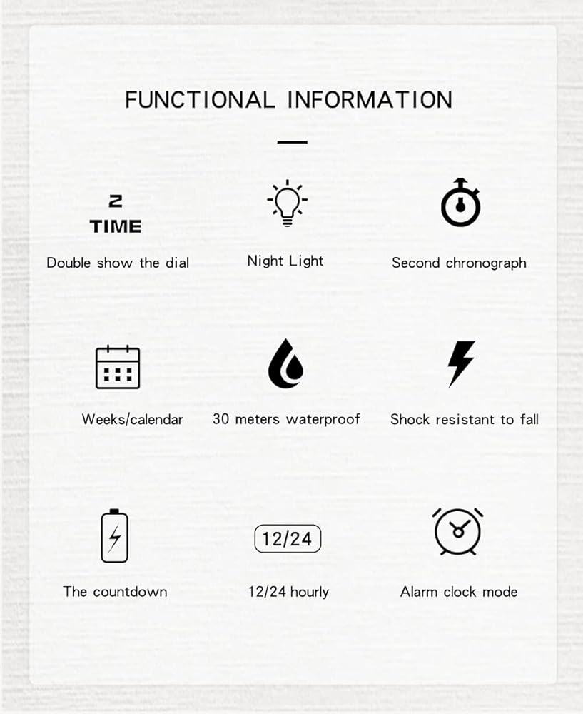 【Multi-function sports watch】: with 12/24hour clock, stopwatch, dual-time display, independent alarm, , calendar, LED backlight, waterproof, shockproof and other functions. These features make it the perfect choice for all kinds of outdoor sports and everyday use. Such as running, climbing, fishing, etc.