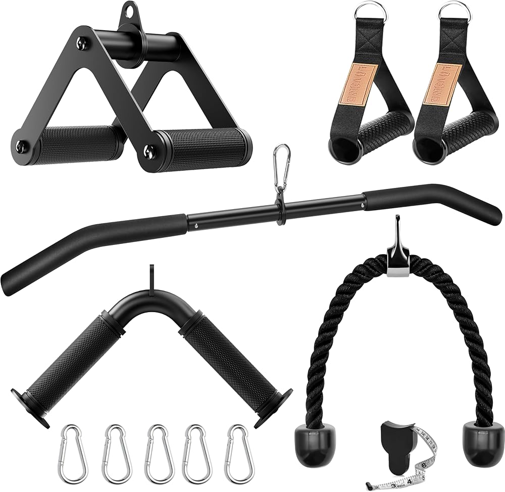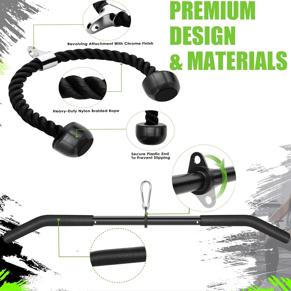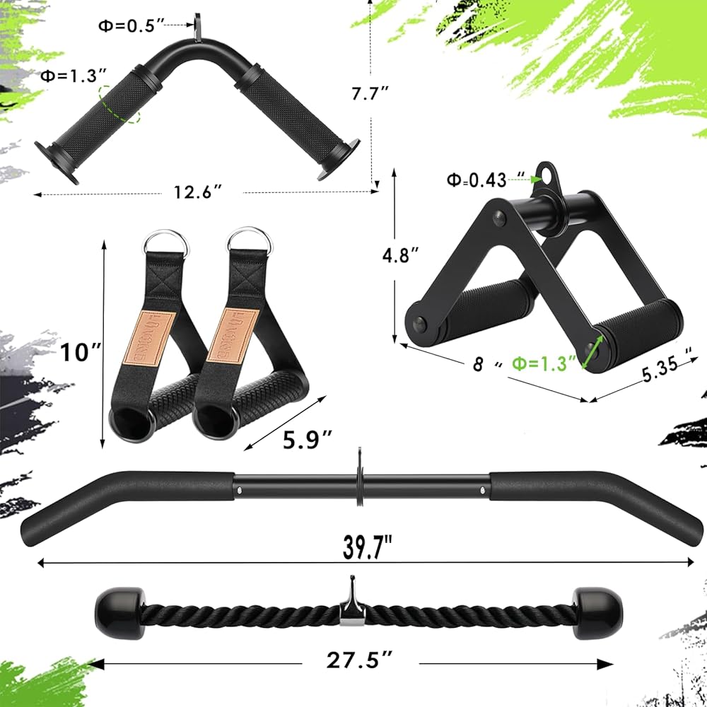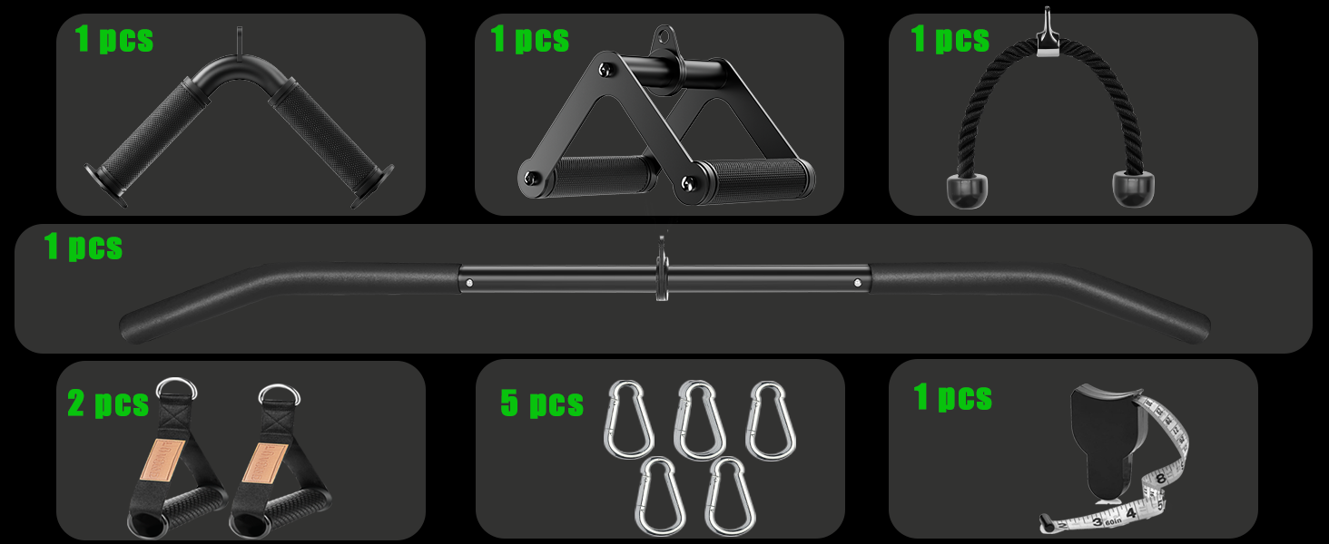 The Cable Machine Attachment Set Package Includes - 1x39.7"LAT Pulldown Bar 360 Rotation ,1 x Double D Rotating Bar, 1 x V-Shaped Bar , 1 x Tricep Rope, 2 x Cable Machine Handles, 3 x Carabiner,1x Measuring Tape