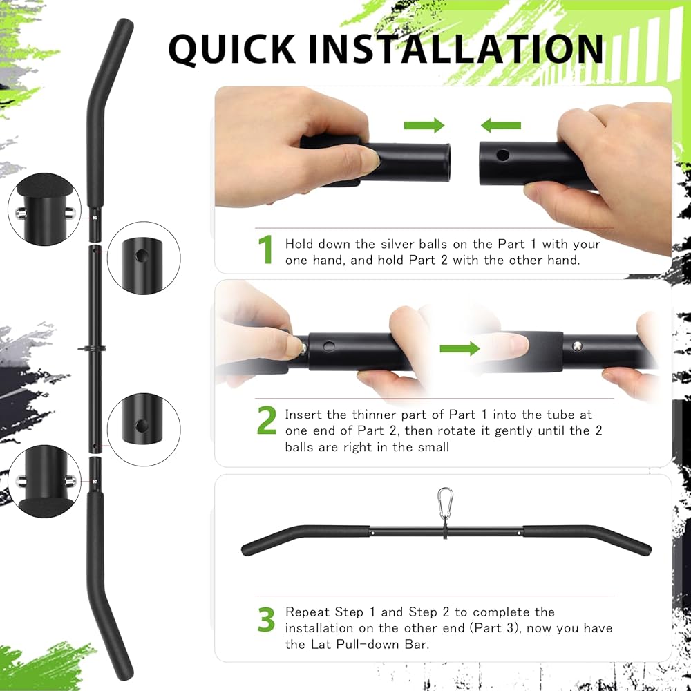 360° Rotation & Compact Storage-With its 360-rotating design, the lat pulldown bar attachment reduces friction to the fullest, enhancing your exercise effectiveness. What's more, it's split into three components for space-saving storage, and when assembled, the parts connect tightly without any shaking. Every tool needed for installation is provided in the box