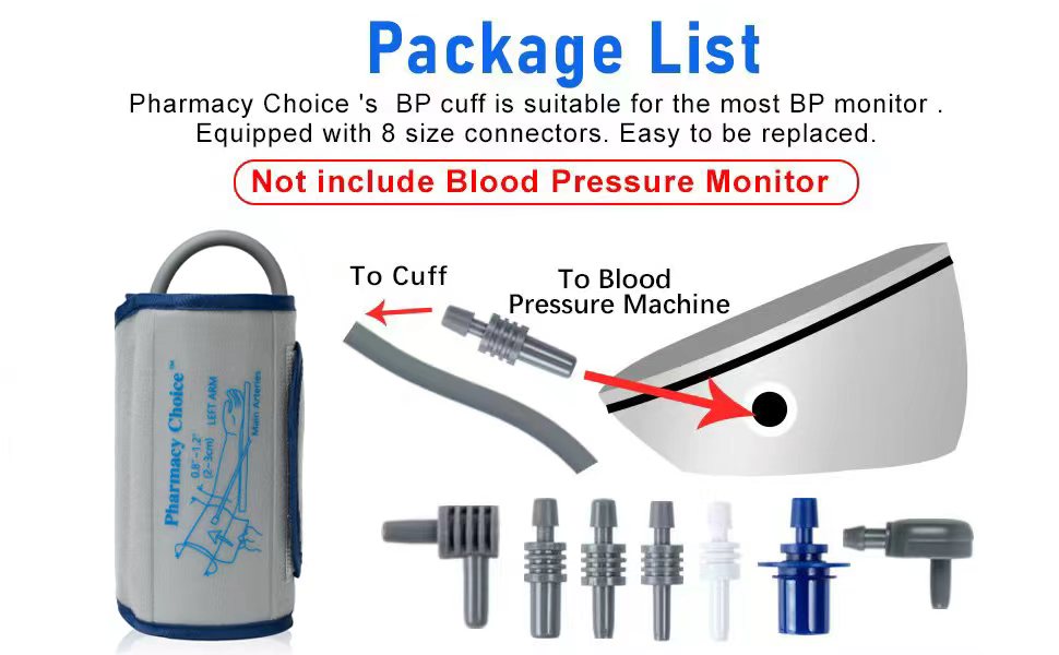 Package Including: Large blood pressure cuff with one 5mm connector. And extra 4mm connector, 4.6mm connector, 5mm connector (2 types), 6mm connector, 7mm connector, 11.5mm connector, quick guide manual ( Not include a blood pressure monitor)