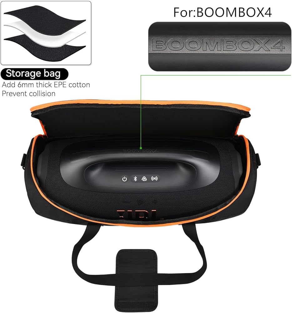 Perfect fit: A portable bag designed specifically for JBL Boombox 4 portable Bluetooth speakers. Appearance dimensions of storage bag (length * width * height)mm: 520 * 245 * 275 /inch: 20.47 * 9.65 * 10.83