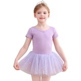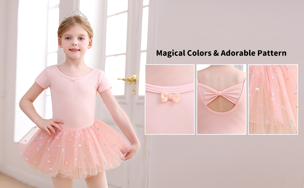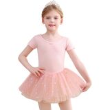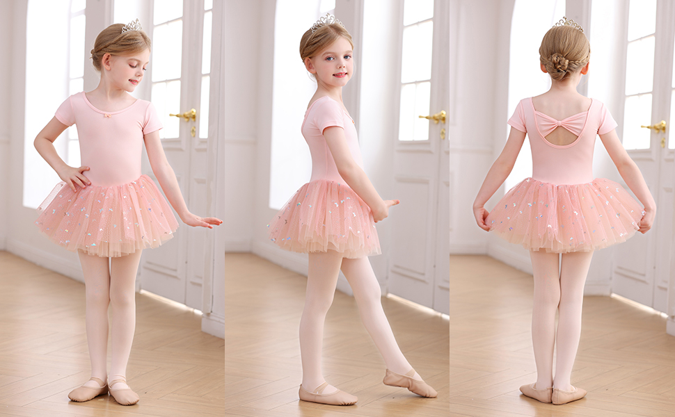 Ballet Leotards for Girls Back Bow Dance DressThis toddler ballet leotard features a back bow cutout + short sleeves + a star-patterned tutu skirt — perfect for ballet classes or recitals, blending leotard functionality with dress charm.