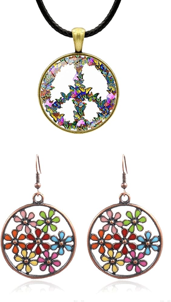 Flower crown hippie glasses, peace sign necklace and earings are almost all accessories you need to complete your 70s pizzazz look and take you go back to the hippy era