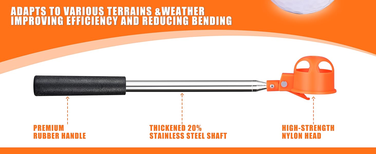 STAINLESS STEEL TELESCOPIC GOLF BALL PICKER: Stainless steel telescopic pole, rust-resistant even in water, with excellent hardness and no deformation when fully extended for stable pick-up control
