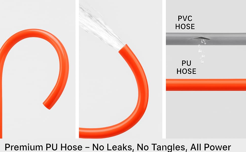 Flexible PU Tubing: Featuring thickened PU tubing, this hose offers smooth, flexible stretching and high resistance to pressure, ensuring long service life and preventing leaks during use. Perfect for various applications, widely used in auto repair shops, car dealerships, production workshops, and agriculture.