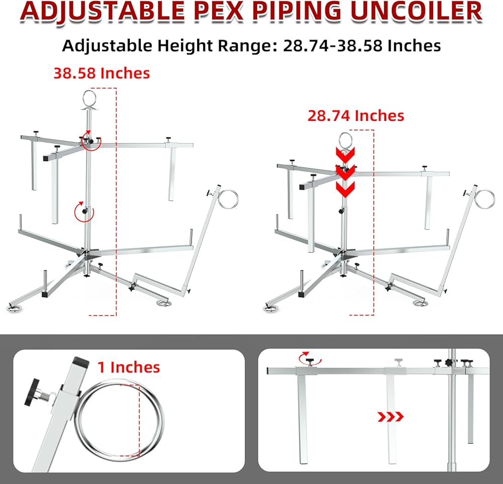 【ADJUSTABLE DESIGN】Featuring quick-lock knobs for easy height adjustment from 28.74" to 38.58", this uncoiler accommodates standard PEX tubing sizes from 3/8" to 1". The adjustable support arms securely hold 1000 ft of 3/8"-1/2" or 500 ft of 5/8"-1" PEX pipe for smooth, tangle-free operation.