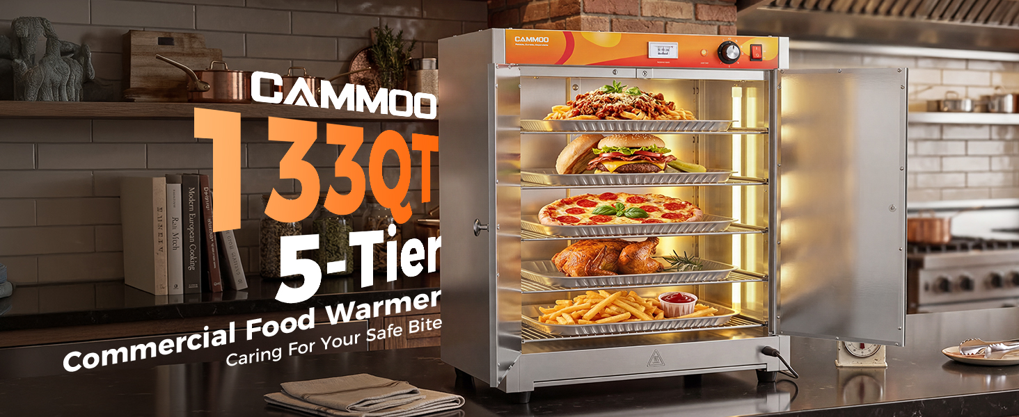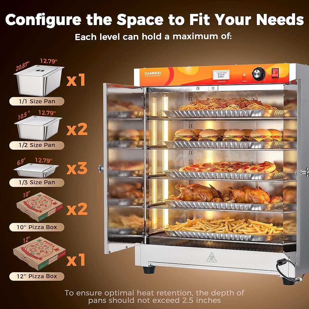 MASSIVE 133QT CAPACITY & 5-TIER ADJUSTABLE SHELVING: The comercial food warmer stores up to 13-inch pizzas, 1/1 hotel pans, multiple 1/2/1/3 trays, tin foil plate or deli paper sheets effortlessly with 5 adjustable mesh racks. Perfect for meal prep, buffets, or food trucks—maximize efficiency during peak hours without compromising space.