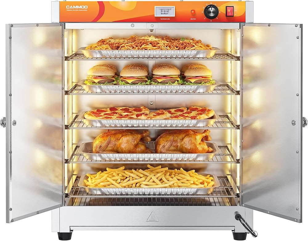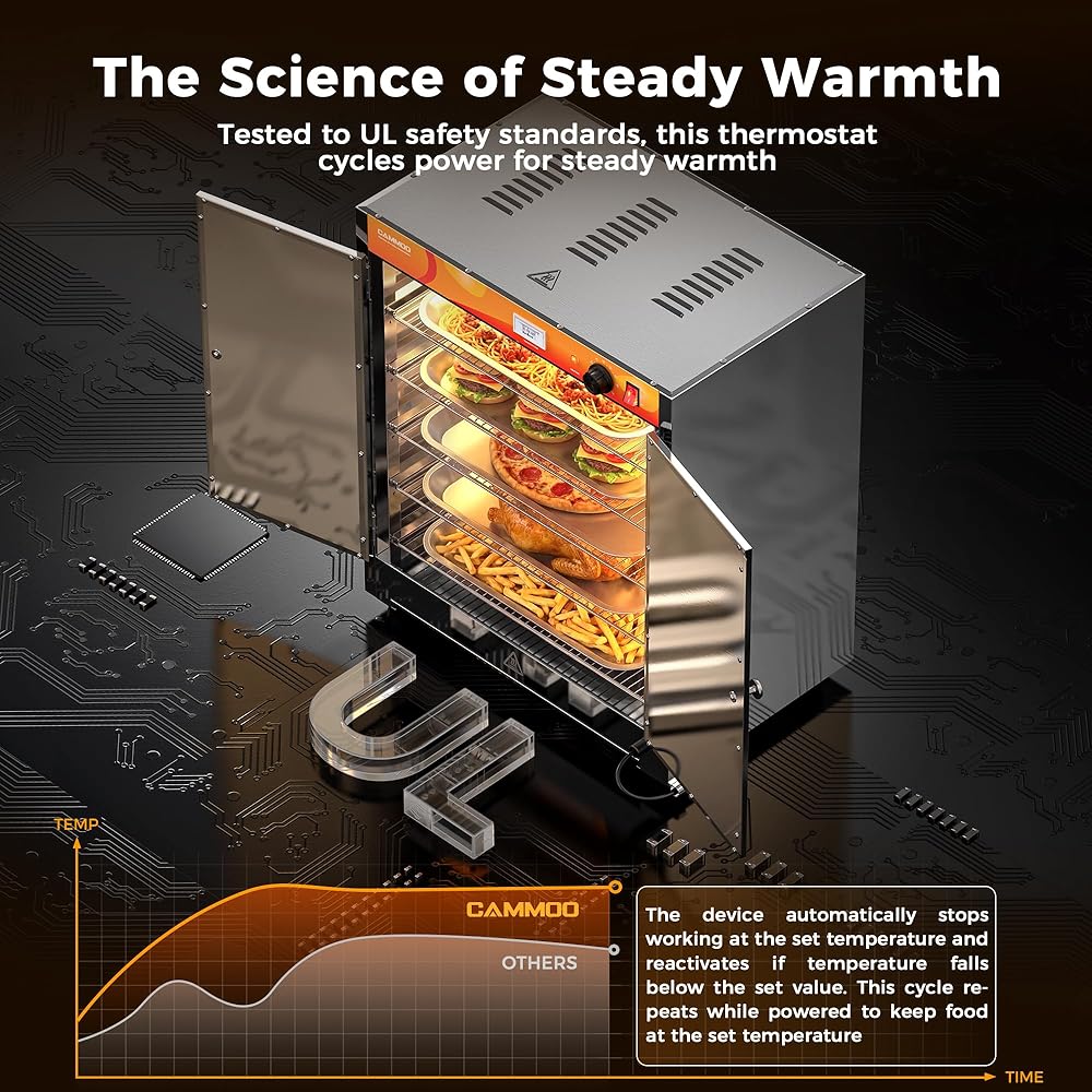 4-IN-1 VERSATILITY FOR ANY FOOD SERVICE: From school cafeterias to food trucks and catering events, the buffet servers and warmers guarantee hot, fresh meals every time. Its anti-short circuit design and magnetic-seal door ensure safety and reliability, making it a must-have for professional kitchens. Plus, enjoy 4-in-1 functionality: keep meals warm, rise dough perfectly, dehydrate snacks crisp, and thaw foods gently—effortless versatility for every chef!