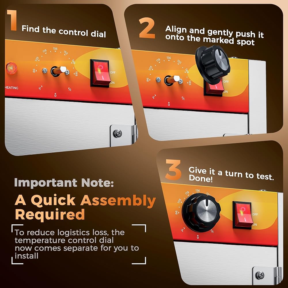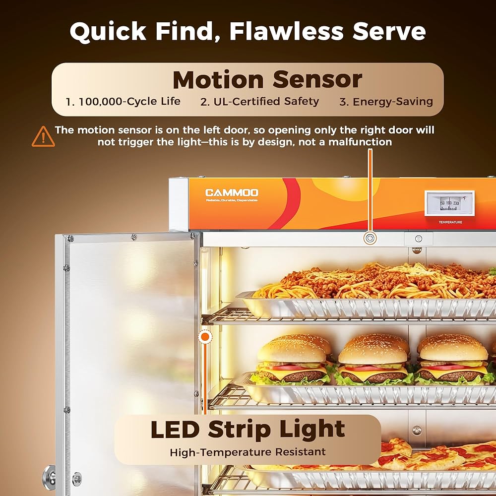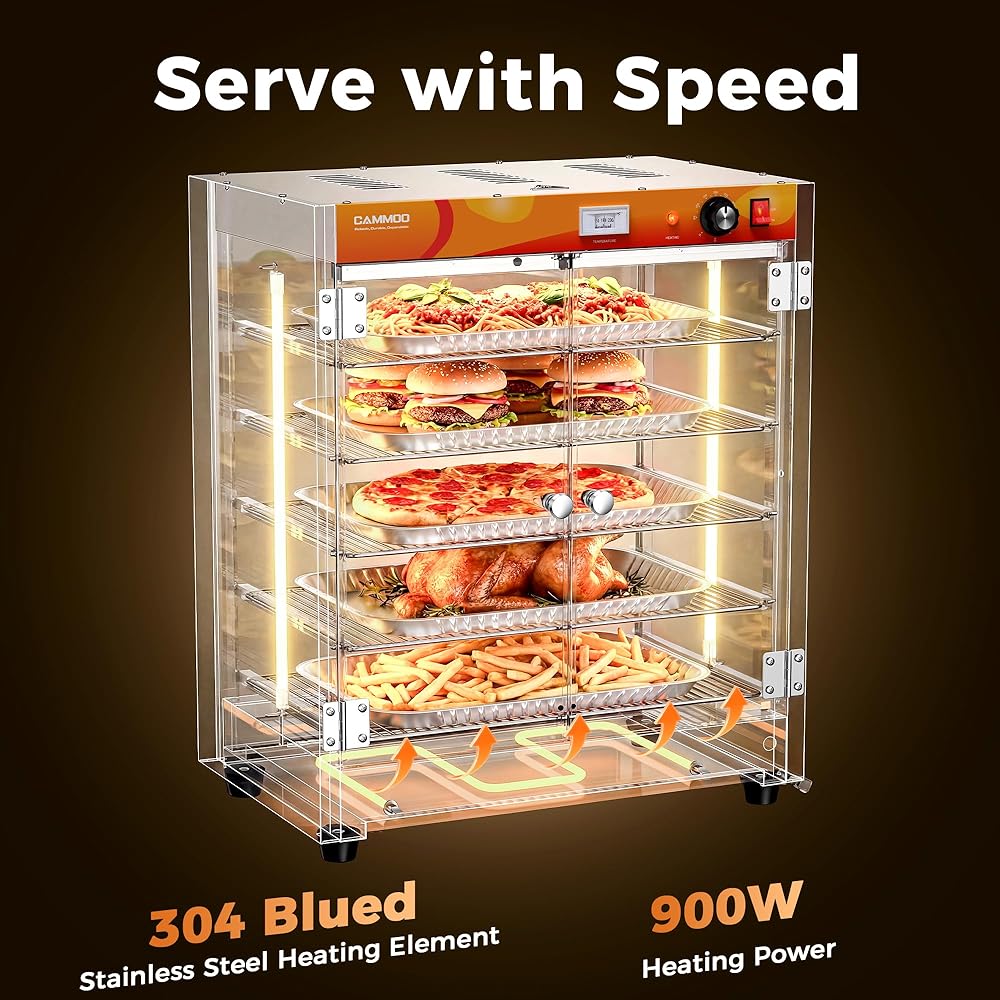 RAPID HEATING & ENERGY EFFICIENCY: The food warmer equippeds with a powerful 900W heating system and 304 blued stainless steel heating element, this food warmer heats 25% faster than traditional models. Ideal for high-volume kitchens, it reduces pre-service wait times and cuts energy costs while maintaining durability.