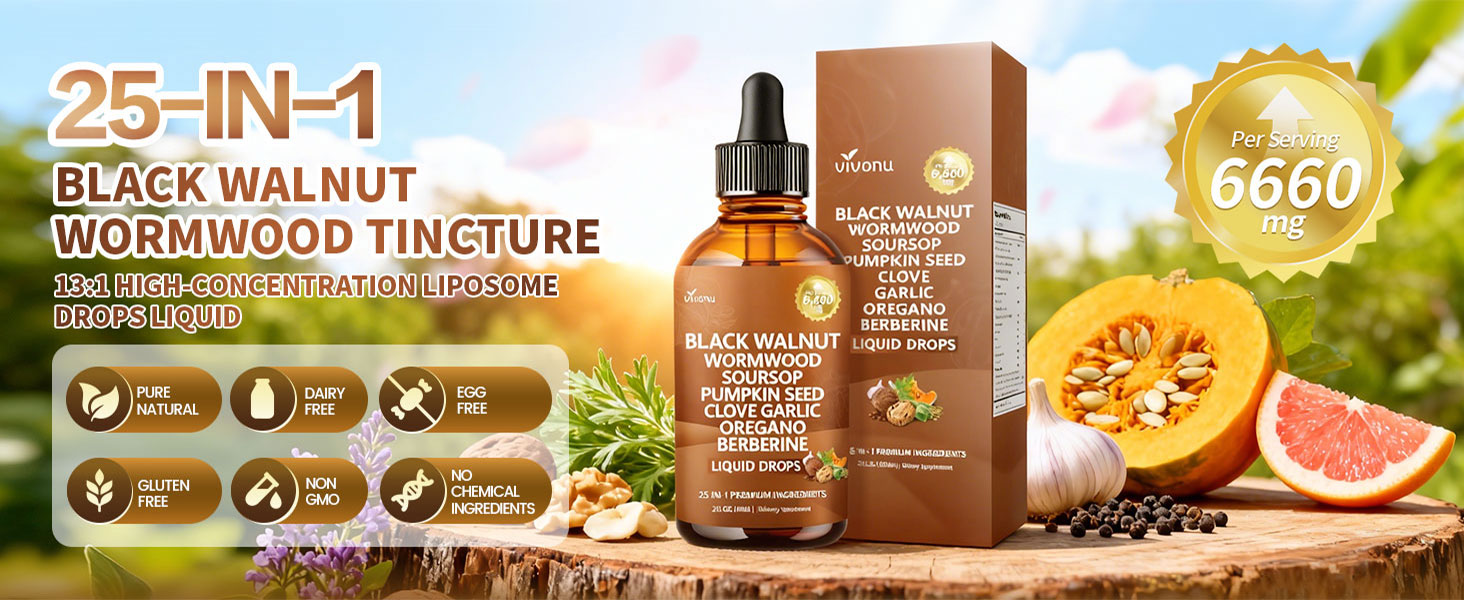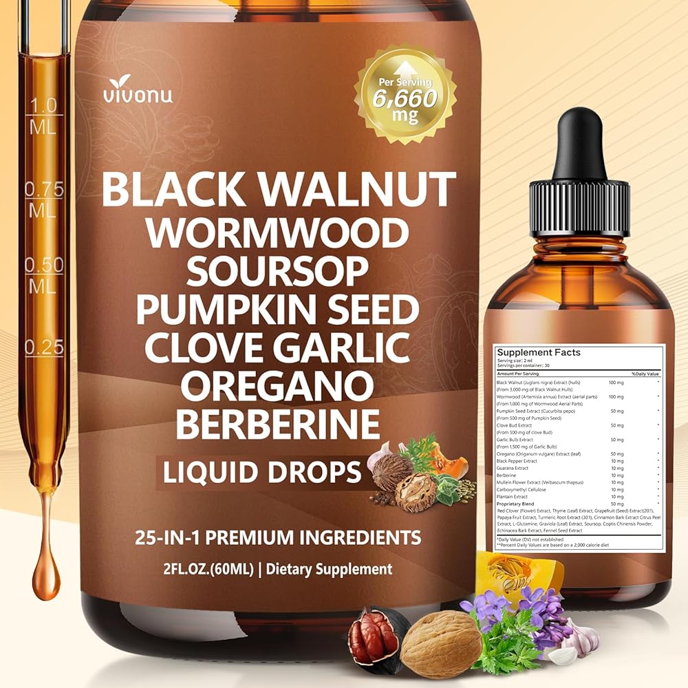 25-IN-1 Liquid Drops for Complete Cleanse Support: Contains Black Walnut Hulls, Wormwood, Clove, Pumpkin Seed, Garlic Bulb and more. Designed to support cleanse for humans, gut cleanse, and overall wellness maintenance via liquid tincture format, easy to absorb