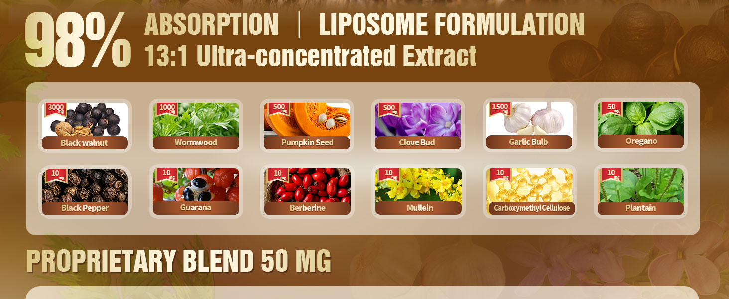 Advanced Liposomal Delivery: Higher absorption & Faster effect, Formulated using liposomal technology, this liquid blend encapsulates the key botanicals such as Wormwood, Black Walnut, Clove, Garlic, allowing the nutrients to be protected during digestion and supporting optimal absorption and bioavailability