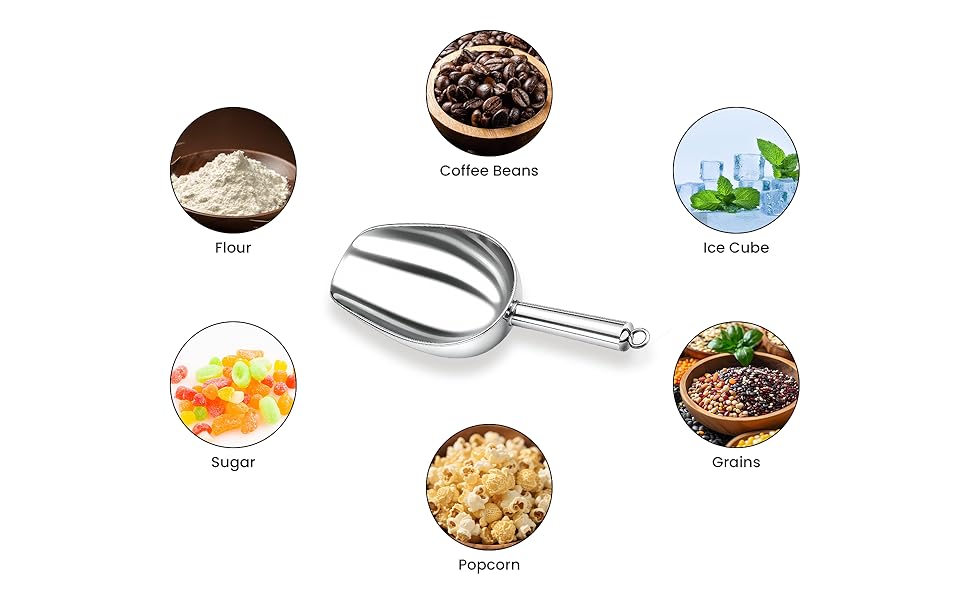 EXQUISITE CRAFTSMANSHIP: Engineered with smooth, rounded edges with no burrs, This metal ice scoop keeps user safety during every use, Full welding and seamless stainless steel construction, won't bend or break under pressure, Sturdy and made to last, It also features a built-in hanging loop makes storage easy