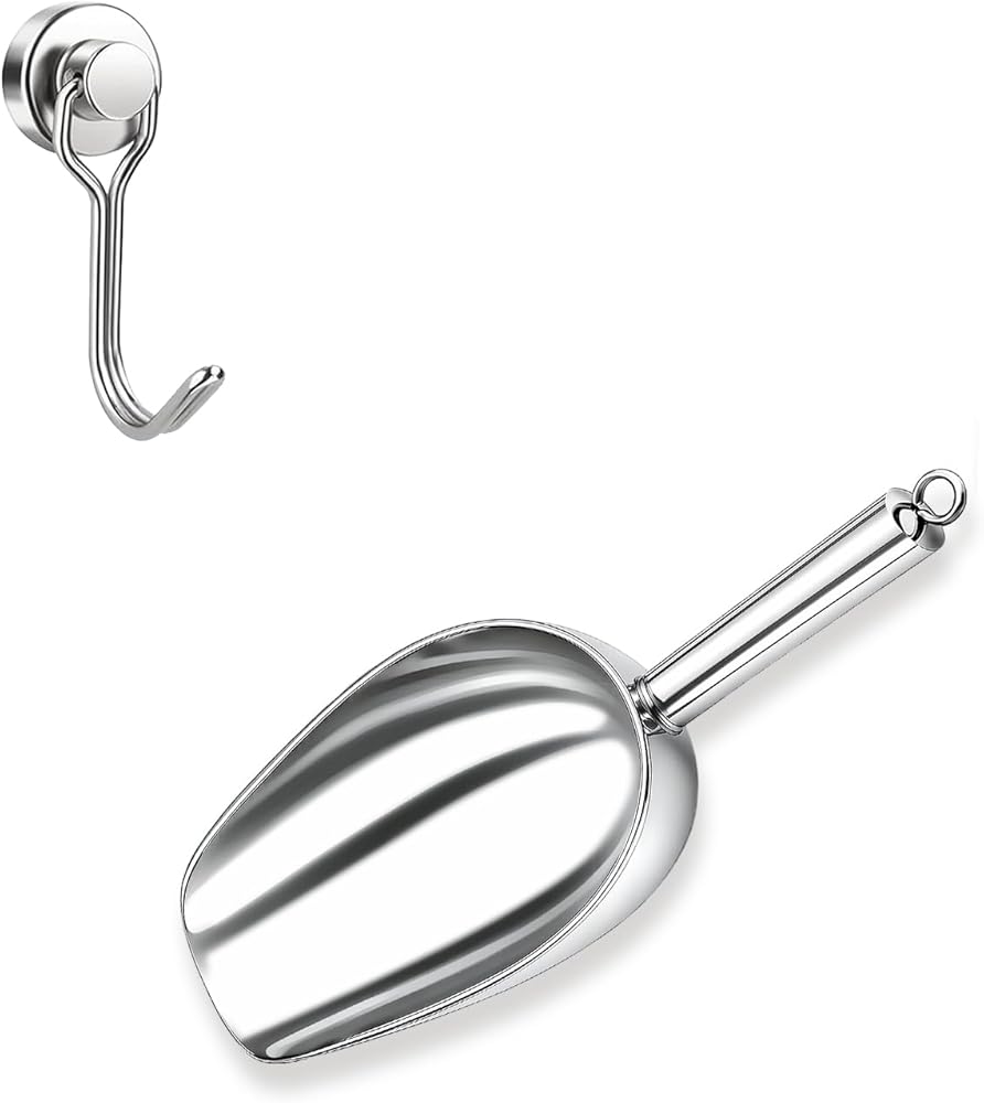 PREMIUM STAINLESS STEEL: The ice scoop with magnetic hook both are crafted from heavy-duty pure stainless steel, Without any harmful substances, 0.8mm thickness and tougher than standard options, It won't rust or dent when breaking up hardened ice, Unlike plastic scoops, it won't chip or peel, Longer-lasting solution for your bar or kitchen in the daily use