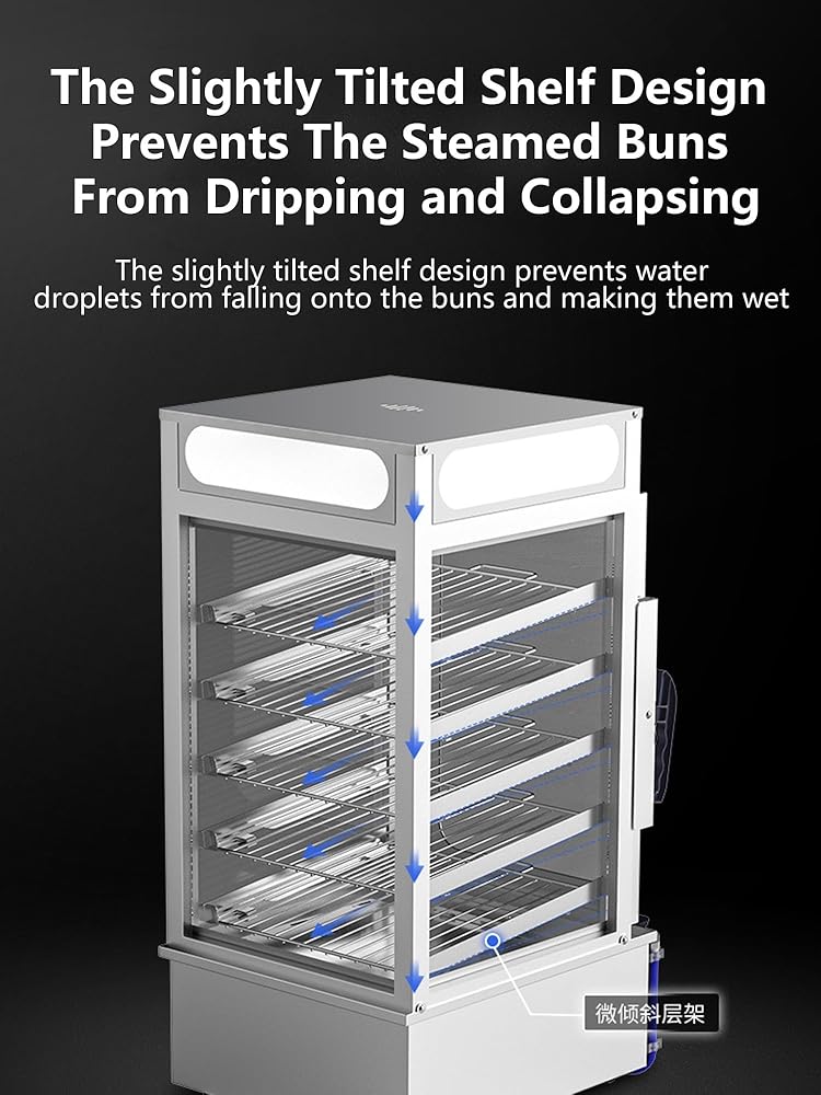 【Enhanced Insulation and Warmth】This commercial bun steamer electric food display with double-layer tempered glass doors and silicone seals minimizes steam leakage, locking in food temperature and flavor. The top inclined glass design recirculates steam, prolonging warming time and keeping food from dripping with water vapor droplets. Convenience/Breakfast store good assistant.