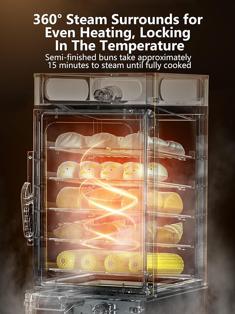 【Temperature Control with Knob】With a broad temperature range of 86℉~230℉ (30-110 ℃), you can maintain the optimal heating state for various foods at any time. It's easy to operate with a knob for temperature control, and internal temperature sensors ensure precise insulation, maintaining a constant temperature as needed. Ideal for steaming frozen buns, fresh buns, and a variety of steamed delicacies to enhance customer appetites.