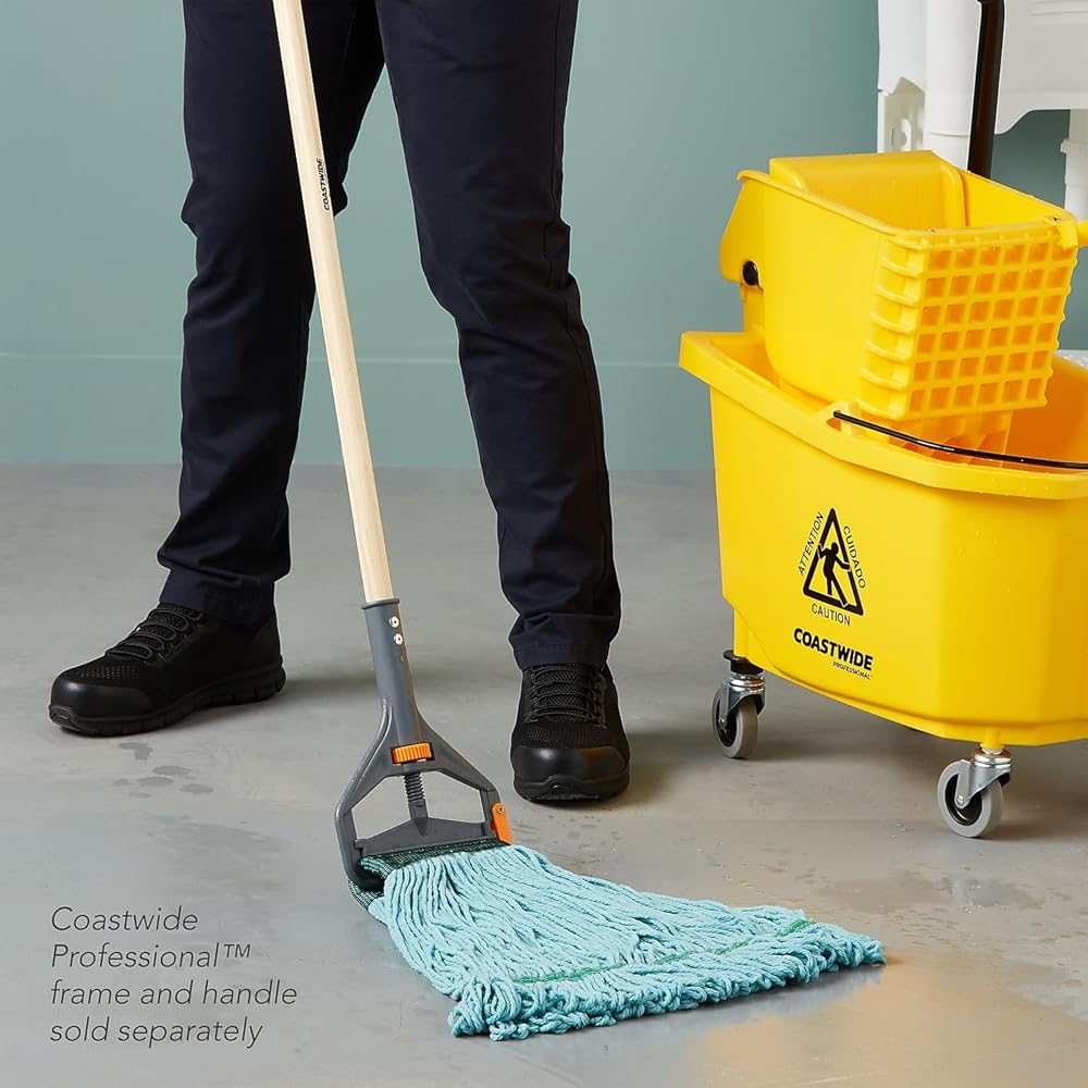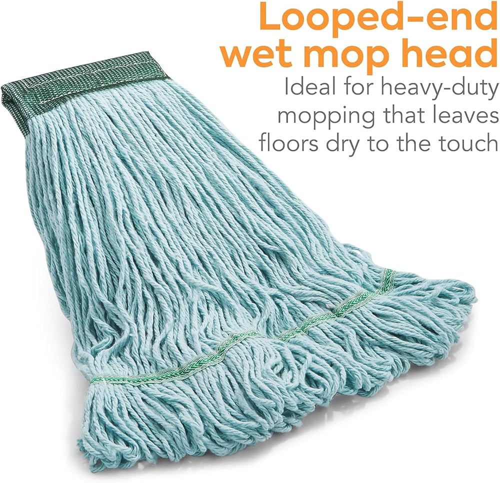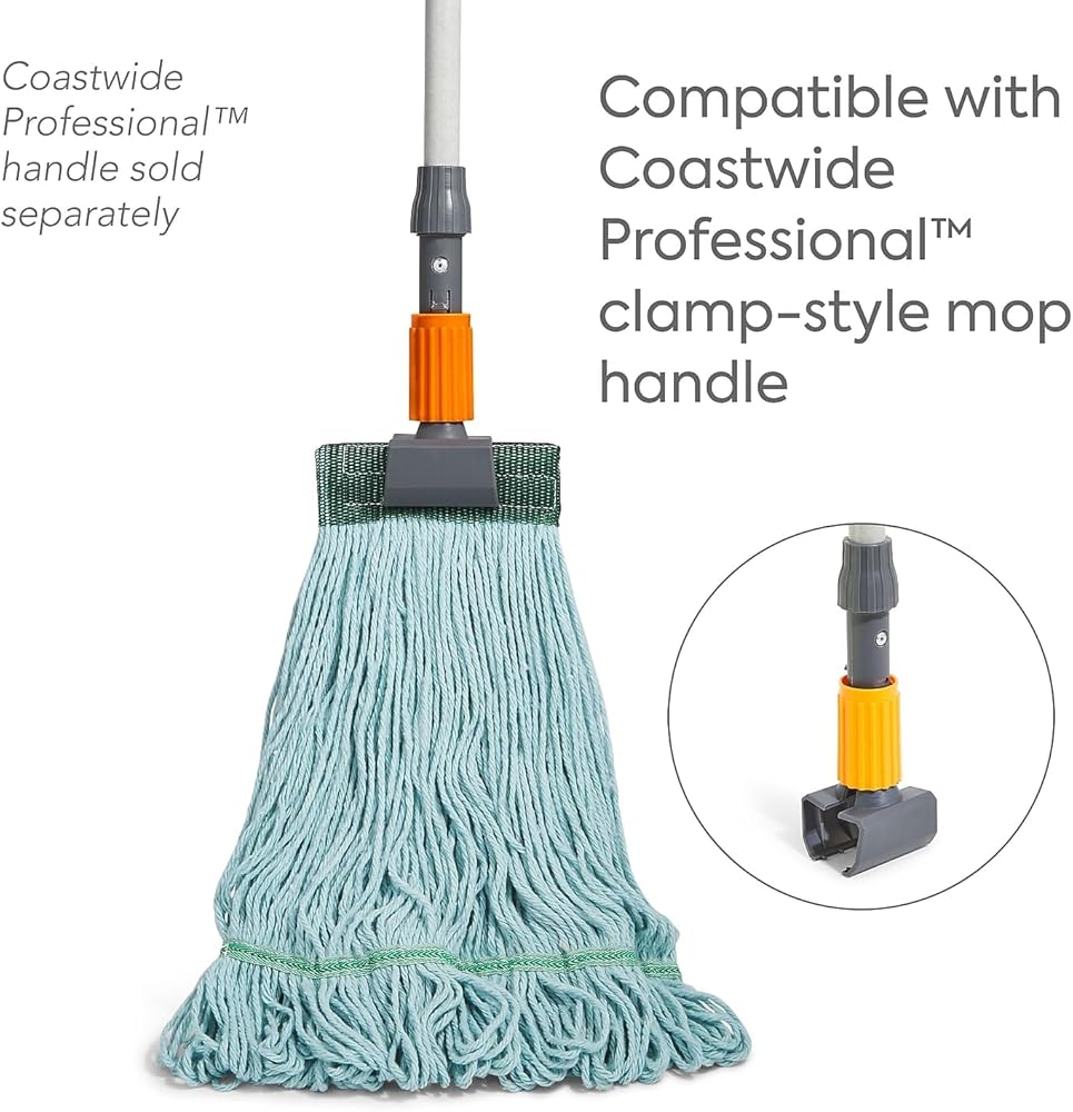 Maintain a clean, spotless floor with this blue loopedend wet mop head. The recycled PET and cotton blend materials offer durability and quick release of cleaning liquids, while the reusable design provides efficiency. The loopedend configuration allows for extra surface coverage and deters frays and tangles. This Coastwide Professional loopedend wet mop head can hold up to 20 ounces of liquid for thorough effective cleaning. Features. Highly durable loopedend wet mop head for quick spill pickup or chemical application and superior durability. Made of a PET/rayon blend. For indoor useSpecifications. Color Blue. Size 5 in.. Mop Broom Material Recycled PET/Cotton Blend. Mop Head Type LoopedEnd. Size Family Medium. Type of Wet Mop LoopedEnd Mop. Wet Mop Feature 5 Headband