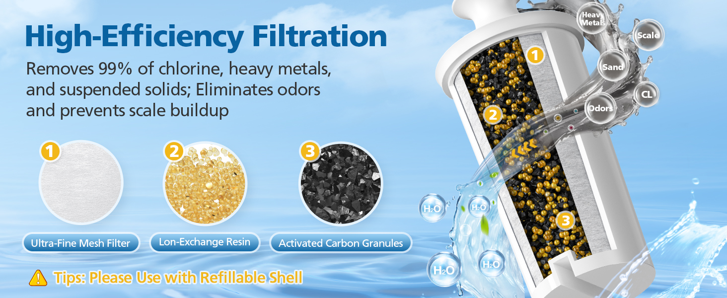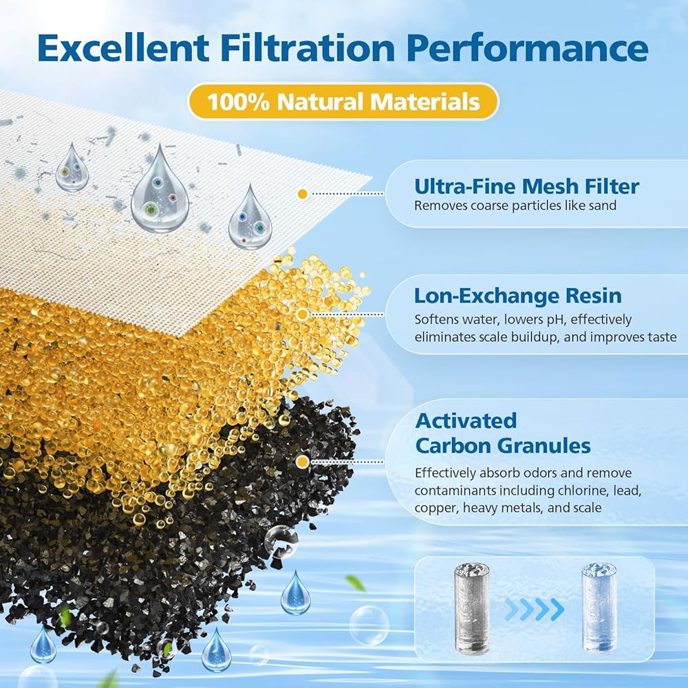 【𝐃𝐮𝐚𝐥 𝐅𝐢𝐥𝐭𝐫𝐚𝐭𝐢𝐨𝐧 𝐟𝐨𝐫 𝐏𝐮𝐫𝐞, 𝐆𝐫𝐞𝐚𝐭-𝐓𝐚𝐬𝐭𝐢𝐧𝐠 𝐖𝐚𝐭𝐞𝐫】Contains high-quality granular activated carbon and ion exchange resin that effectively reduce scale, chlorine odor, impurities, and heavy metals (such as copper and lead). Significantly improves water quality and taste, delivering cleaner, sweeter drinking water.