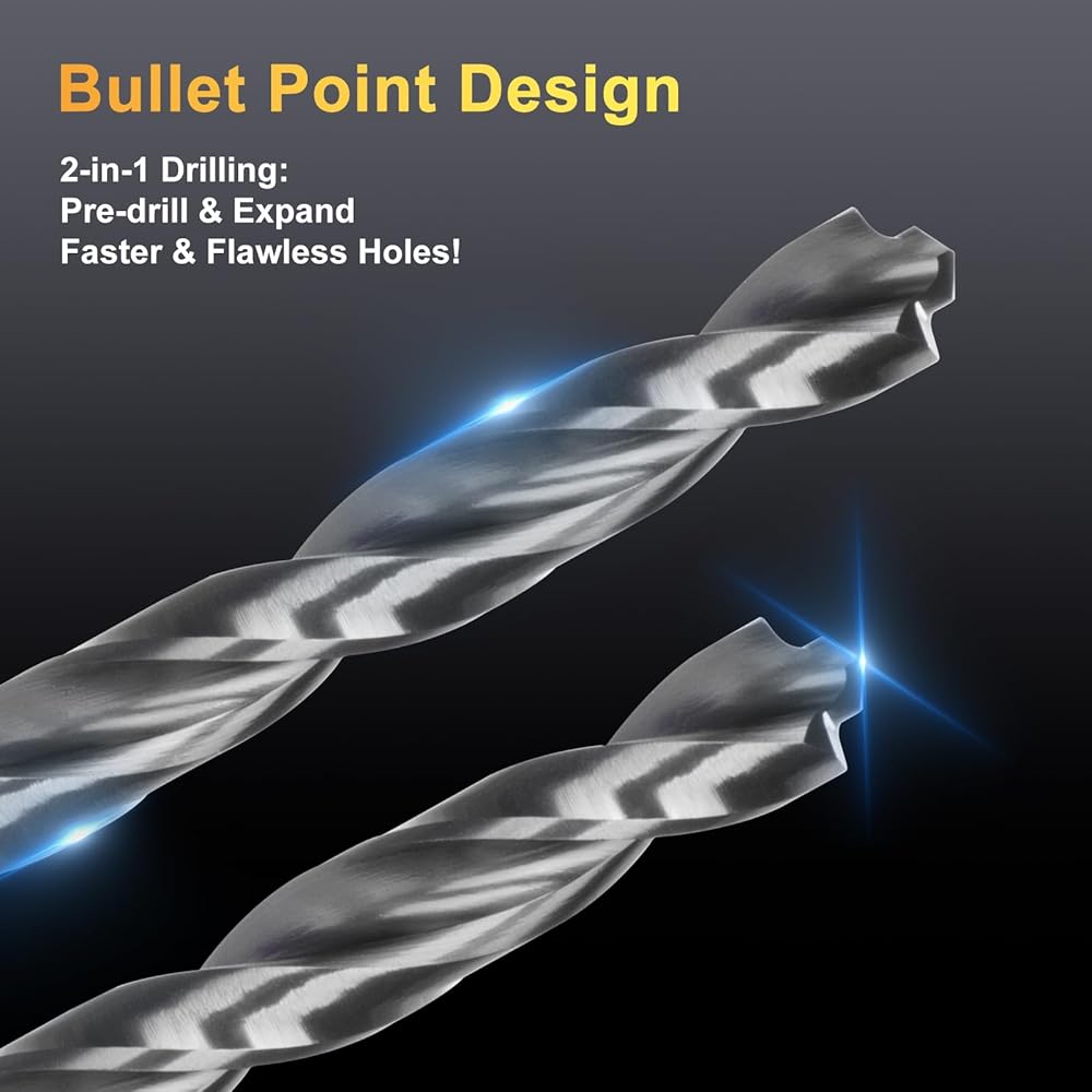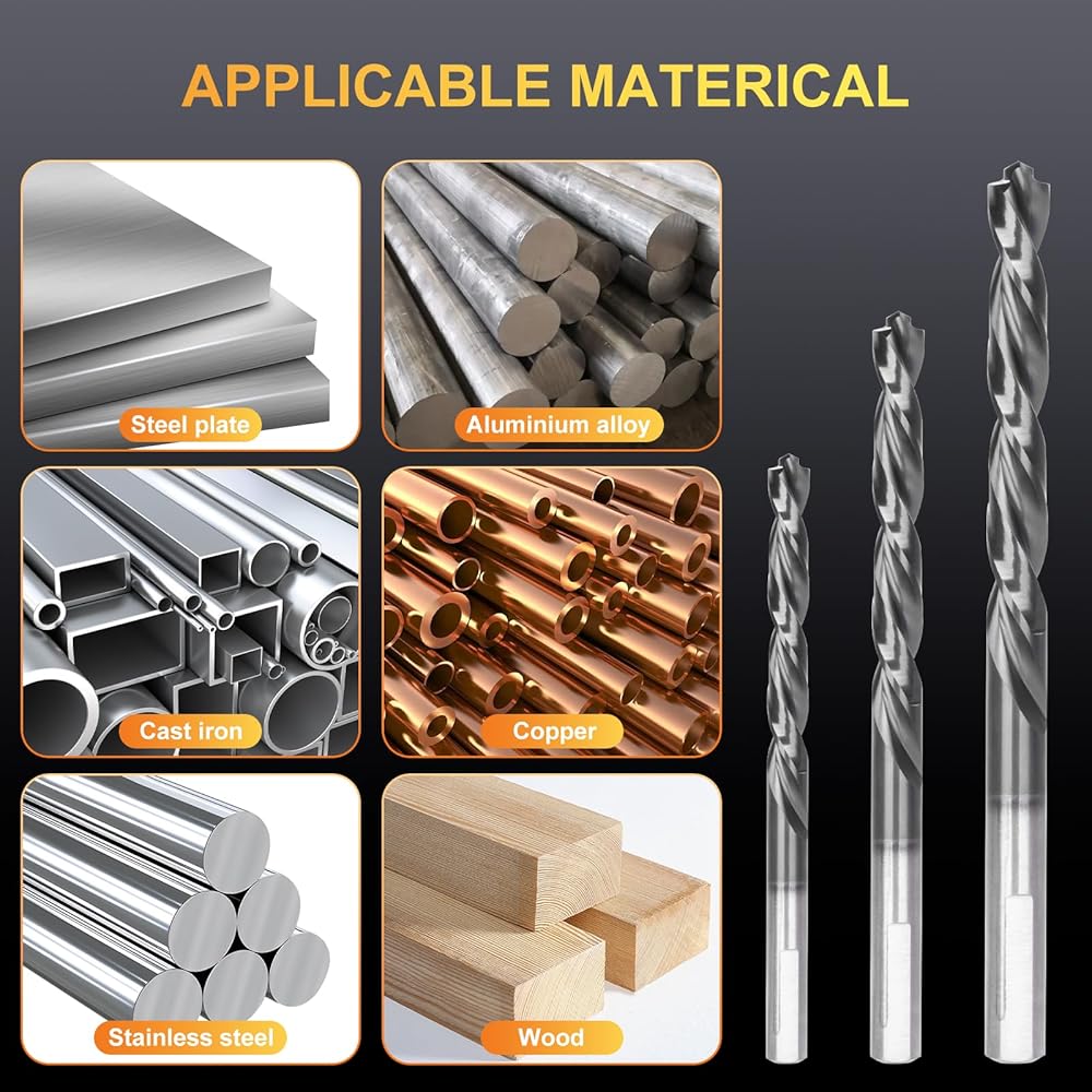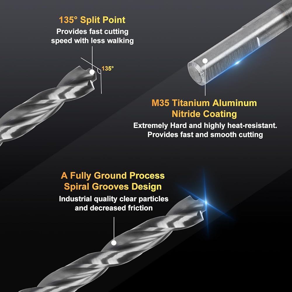 135 Degrees Split Point and Parabolic Flute: With Bullet Point Tip, a fully ground-modified parabolic flute design can clear chips quickly and decrease friction and heat damage. The sharp, self-centering tip minimizes wandering and provides precise and accurate drilling, which can perform well in demanding heavy-duty tasks.