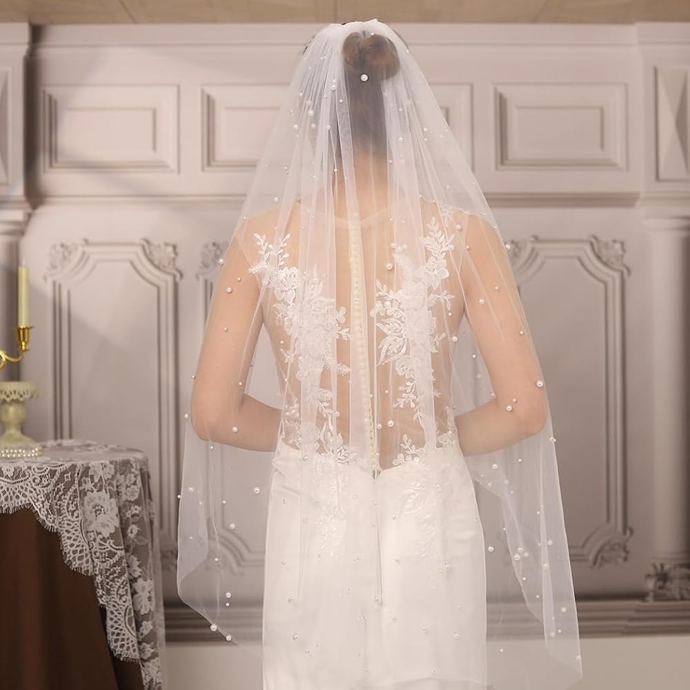Gorgeous wedding veils feature in 1 tier and scattered with Pearls,all pearls were firmly attached which add such a nice touch.