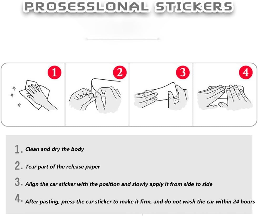 1. Clean the area where you want to apply the sticker thoroughly. 2. Place the sticker on the car, rub and smooth it with a clean rag while gently peeling off the backing paper. 3. Adjust the sticker to the right position and cut off the excess part. 4. If the weather is cold, it can be heated and dried with an electric blower.There are also pasting tools and gifts in the sticker package