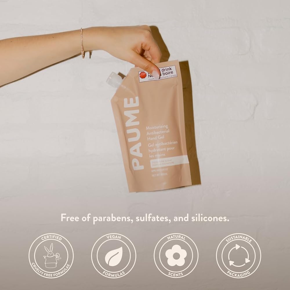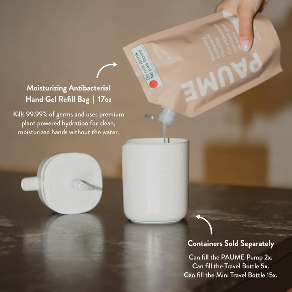Our antibacterial hand gel kills 99.99% of germs and uses premium plant powered hydration for clean, moisturized hands without the water. Our signature scent boasts five essential oils to delight your senses with notes of cedar, citrus, rosemary and lavender. As effective as it is luxurious. This kit has everything you and your loved ones need to clean and hydrate your hands in the comfort of your home: Refillable PAUME Pump (sold empty) 17oz Refill Bag (fills your pump two times) Total of 500 applications