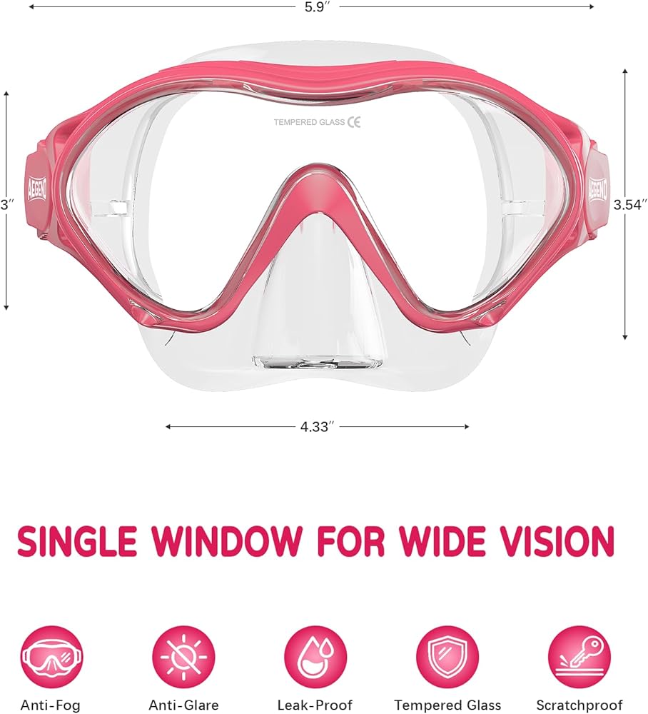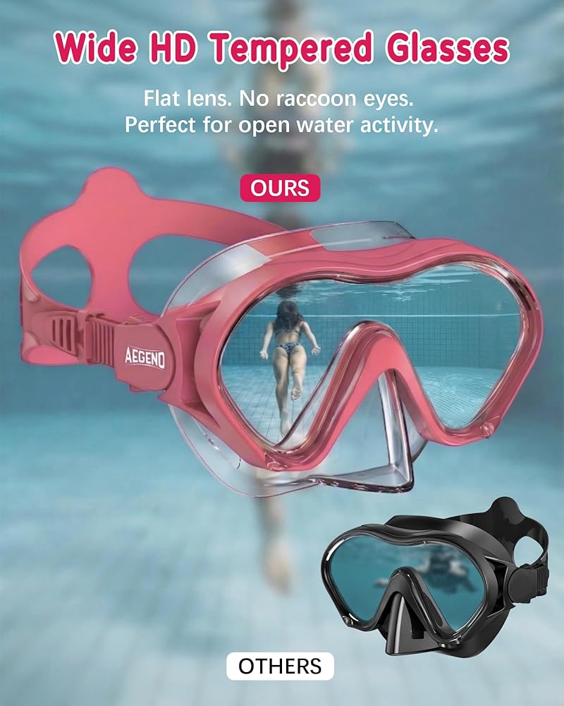 🏊【Panoramic HD Wide View, Anti-Fog, No Raccoon Eyes 】Aegend kids diving mask offer an ultra-wide 180° wide view, giving you a crystal-clear and expansive perspective of your surroundings, safer to swim. One piece glass design enables better and wider vision under water. Engineered with clear anti-fog lenses, these goggles keep vision sharp for underwater explore without fogging issues. The soft silicone doesn't leave marks on face after wearing, suitable for all face shapes.