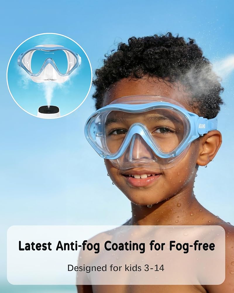 ✅【No Hair Pulling Easy Headstrap Adjustment】Easy Put On/Off: Our kids scuba diving mask feature a soft silicone strap that's non-slip for secure the goggles, eliminating hair pulling and irritation. The quick-adjust strap allow easy customization for a secure fit, perfect for boys and girls. Ideal for swimming lessons or pool games, these goggles stay comfortable during lap swimming and dives. Tips to avoid the leakage: Tighten the mask that the silicone skirt is fully absorbed on your face.