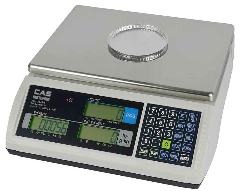 Designed with CAS reliability, the EC-2 Series Counting Scale stands alone its field. High accuracy and simple to use with optional label or receipt printer, the EC-2 provides the features you need fo counting and weighing. Available in four capacities from six to sixty pounds, with the option to connect to a second platform to expand your capacity; it's great treat for use in manufacturing, parts shops, and hardware stores.