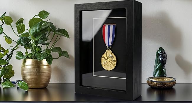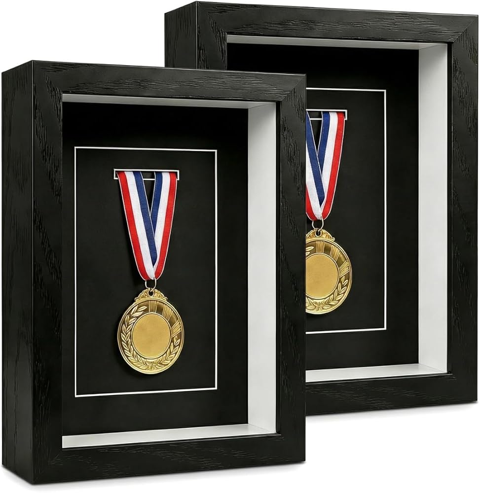 4.5CM DEEP FRAME WITH WHITE MAT – Fits More Than You Think Standard photo frames are too shallow for medals, but this 5*7 inches shadow box offers 4.5cm interior depth—enough to hold medals naturally, including Olympic-style medals with thick ribbons. The extra included white mat adds a professional, gallery-quality touch while serving as a clean backing for DIY projects.