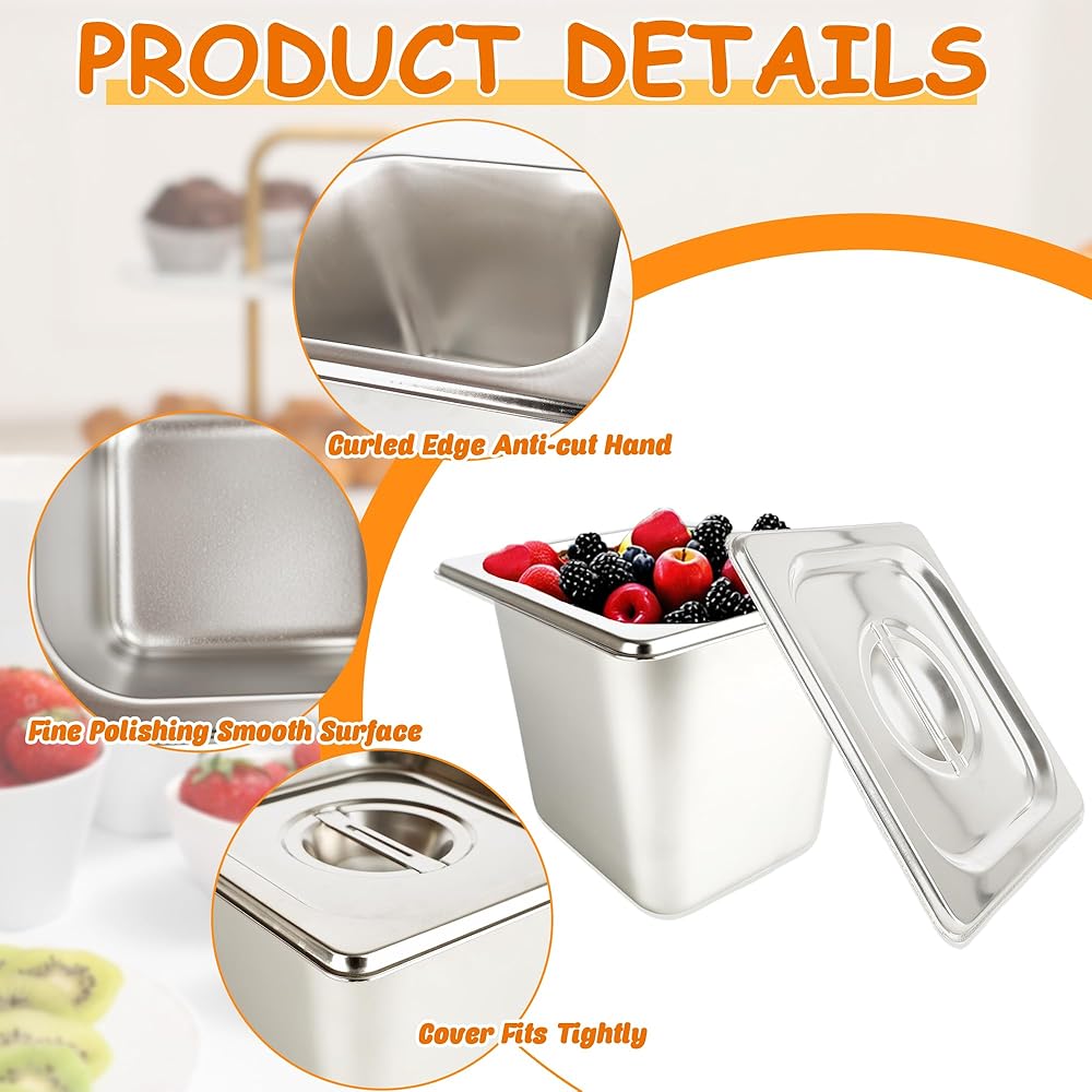 ✅Easy to Clean: 1/6 6 inch deep steam table pan adopts an integrated molded structure, carefully polished by an electrolytic polishing process, the surface is smooth and bright, not easy to adhere to food, reduce stains, easier to clean, and can be stacked when not in use to save storage space. The lid can further help retain heat or keep it clean when scooping is not required