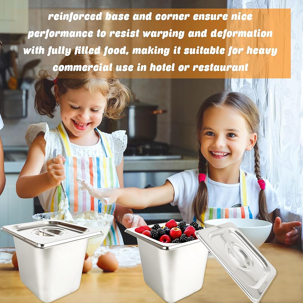 ✅Durable Material: The 1/6 restaurant pan with lids is made of durable, wear-resistant, rust-proof stainless steel, not easy to rust, fade, bend or break, the steamer has ideal thermal conductivity, high and low temperature resistance, can hold hot and cold food, suitable for freezing, baking, steaming and refrigeration