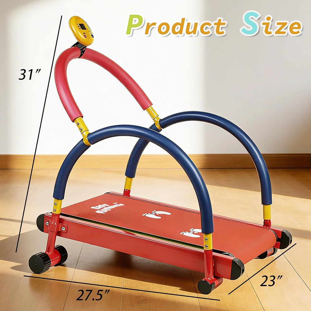 KIDS TREADMILL - Designed with little ones in mind. Introduce your little ones to fitness fun with this kid-sized treadmill designed specifically for active play and exercise. MOTION-POWERED BELT: The treadmill belt operates only when kids walk or jog, automatically stopping when they slow down or stop, making it a safe, non-motorized option. DIGITAL FITNESS TRACKER: Equipped with an easy-to-read LED display that monitors workout time, distance, speed, and calories burned, helping young users track their progress and stay motivated during exercise sessions. BRIGHT & ENGAGING APPEARANCE: The vibrant red platform combined with its distinct arch and blue and yellow accents creates an inviting gym environment, motivating kids to enjoy exercise and build healthy habits through play. Built with safety in mind, this compact exercise equipment helps channel kids' energy into structured physical activity. INDOOR FITNESS EQUIPMENT: Perfect for indoor use during any weather, this treadmill combines strength training opportunities with cardiovascular exercise in a child-friendly format. Exercise gym equipment designed specifically for children! The thoughtful design encourages natural movement patterns while providing a stable platform for developing coordination and building confidence in physical activities. HIGHLIGHTS: Non-motorized. Motion powered. Alloy steel frame. Supports up to 150 lbs. LCD display with 10 minute auto shut off. 2 AA batteries required. (Not included). Dimensions: 31" H x 27.5" L x 23" W.