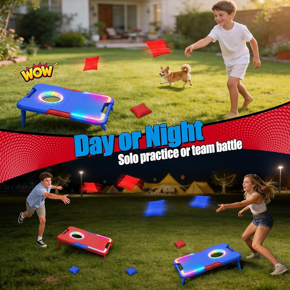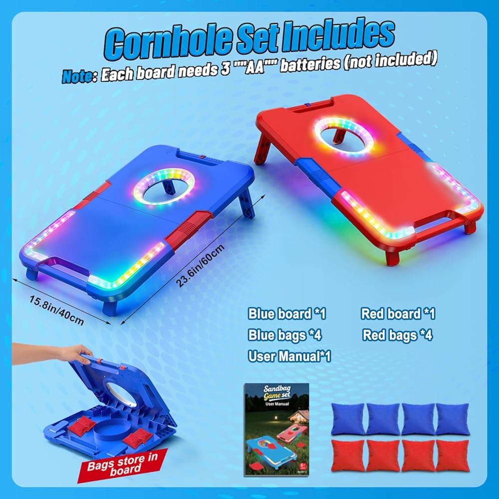 【Cornhole Set Includes】TERRAMSU Light up Cornhole Game Sets includes two 15.7 × 23.6 inches(40*60cm) cornhole board , eight durable canvas bean bags (4 red and 4 blue), and an easy-to-follow instruction manual for quick setup. Simply unfold the board, and you're ready to roll. Each corn hole board requires 3 AA batteries (not included).
